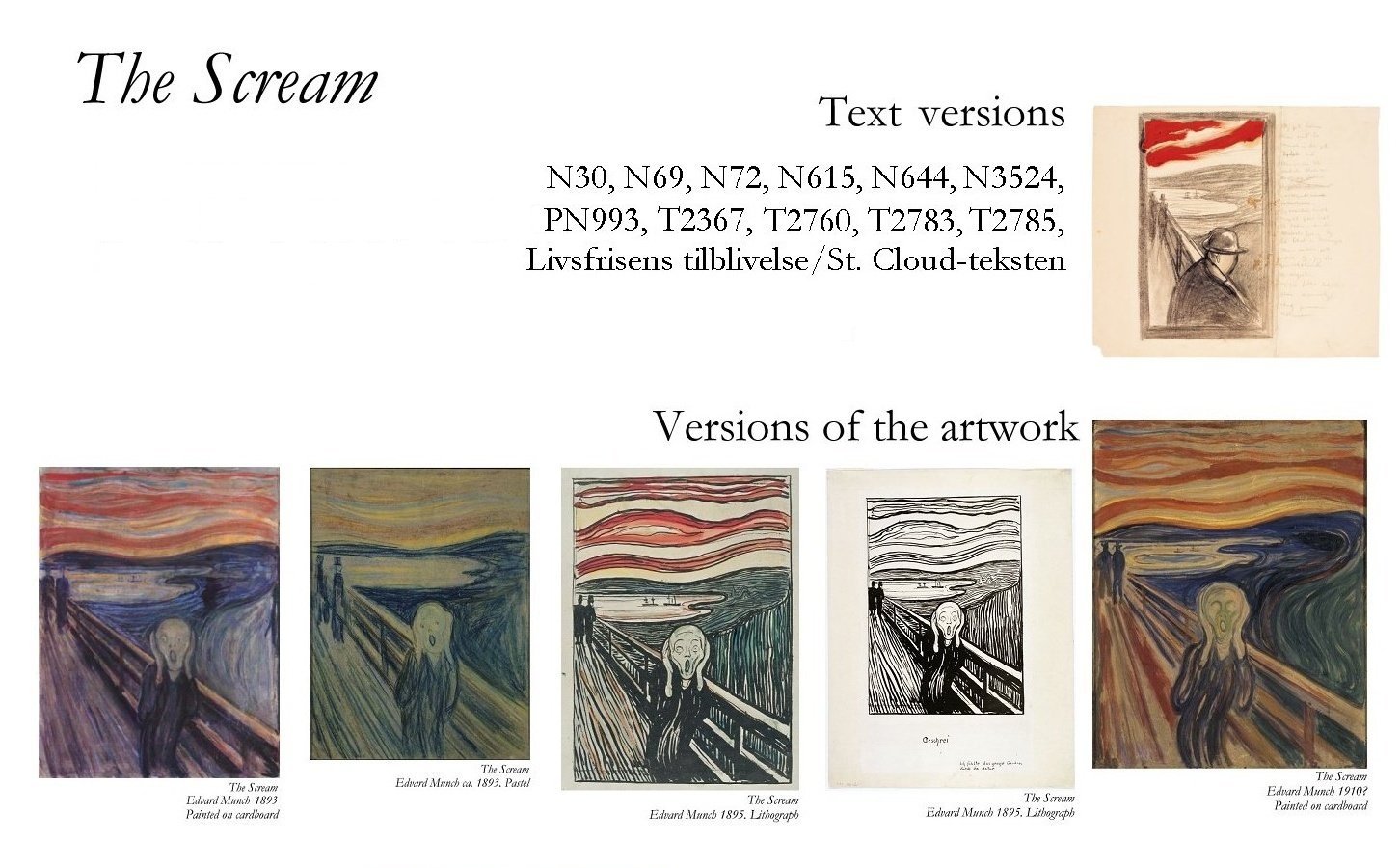 A major challenge in this task is the existence of several versions (which often are created years apart) of both artworks and texts. Munch’s «The Scream» is a world famous icon and the painting and the lithograph (in its many versions, where some also includes text) is well known, but it is not commonly known that Munch also wrote several texts describing the situation that is depicted. There also exists a drawing with a text along its right side. The motif and text is clearly related to «The Scream», and it is generally regarded as an early version of «The Scream» although it is entitled «Despair».