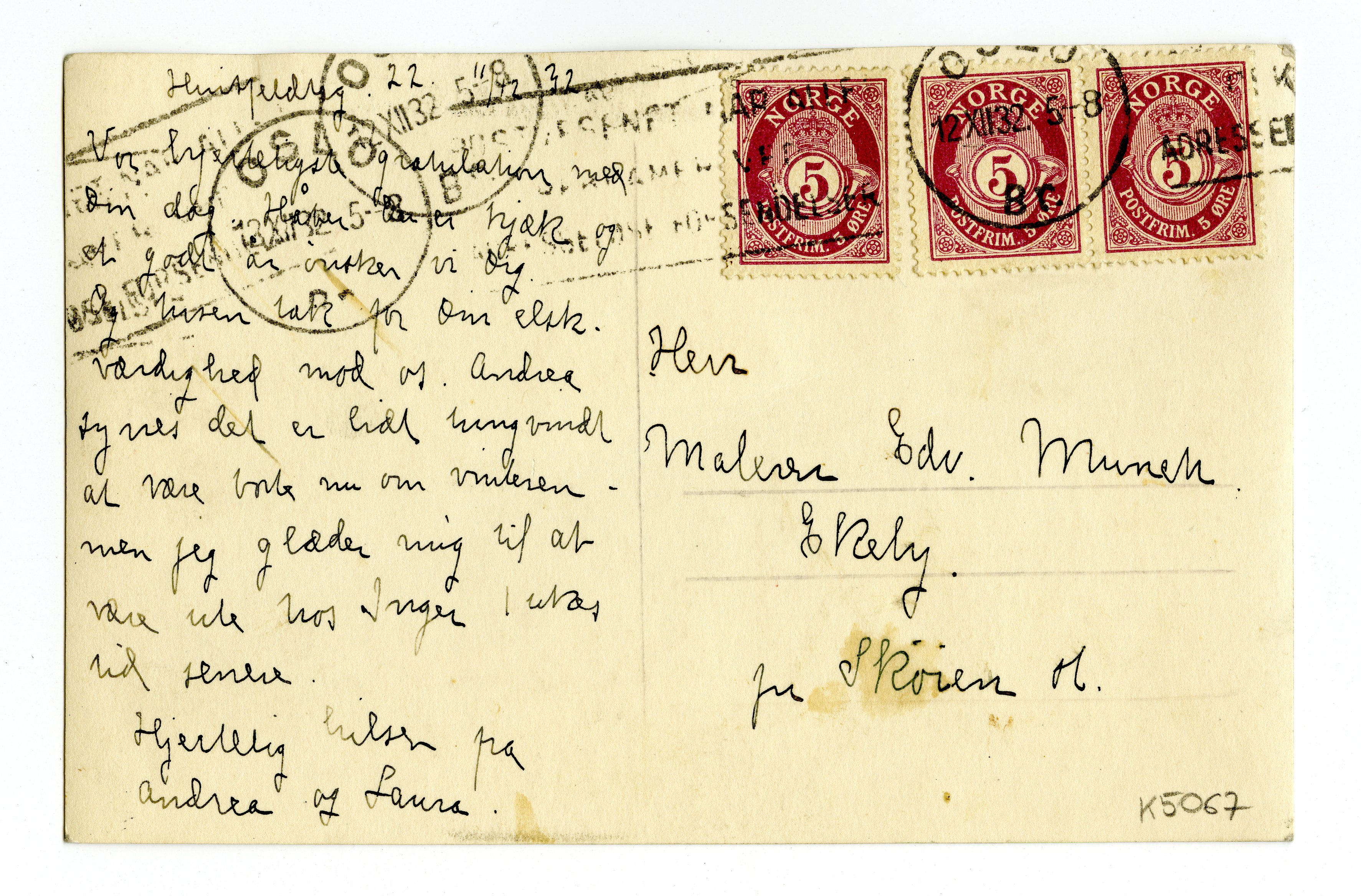 MM K 5067, Munchmuseet. Datert 11.12.1932. Brev fra Andrea og Laura [?].