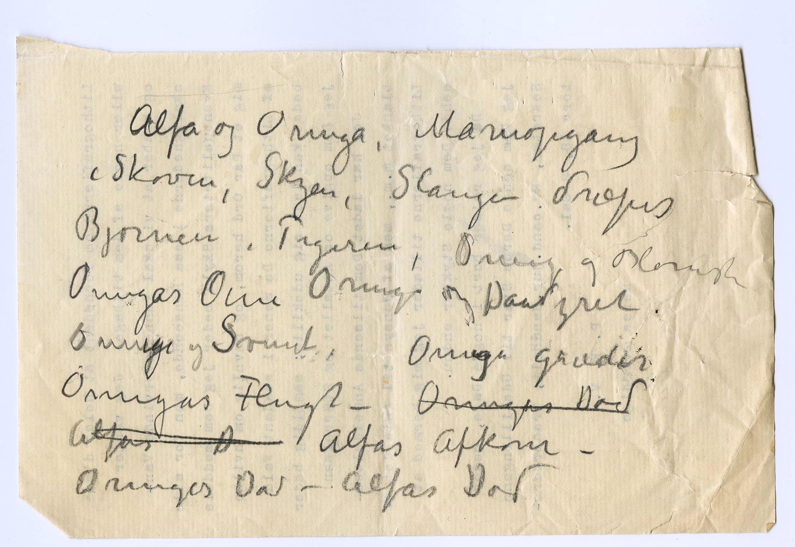 Filologisk kommentar: Liste over alle motivene i Alfa & Omega-mappen. Skrevet på baksiden av et brev. (Antakelig til en trykker/et trykkeri)