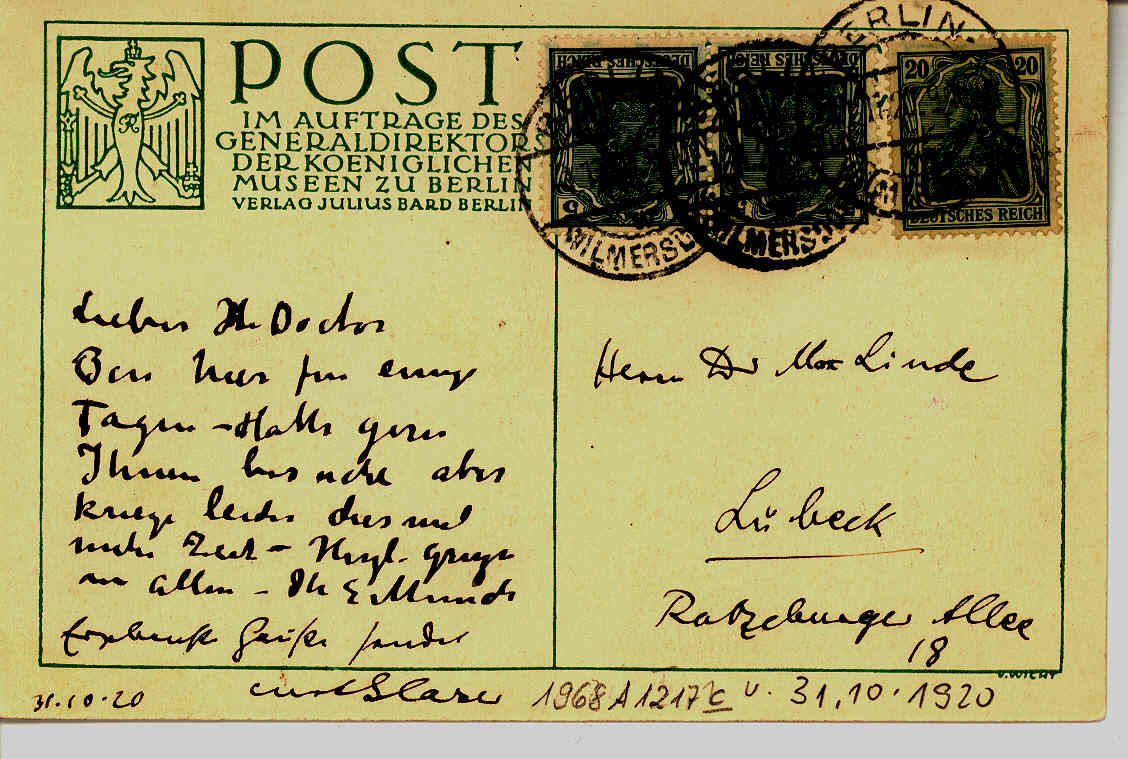 PN 1279, Bibliothek der Hansestadt Lübeck. Datert 31.10.1920. Brev til Max Linde
