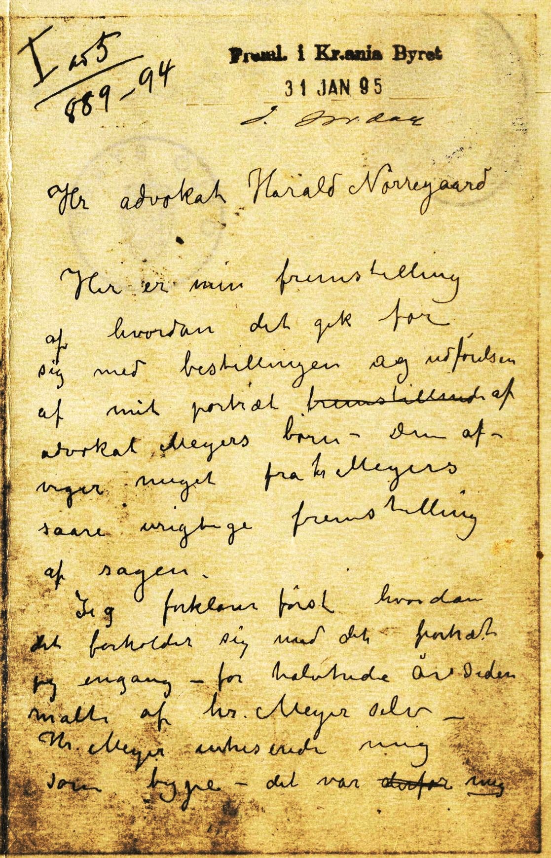 PN 1308, Statsarkivet i Oslo. Datert 31.1.1895. Brev til Harald Nørregaard
