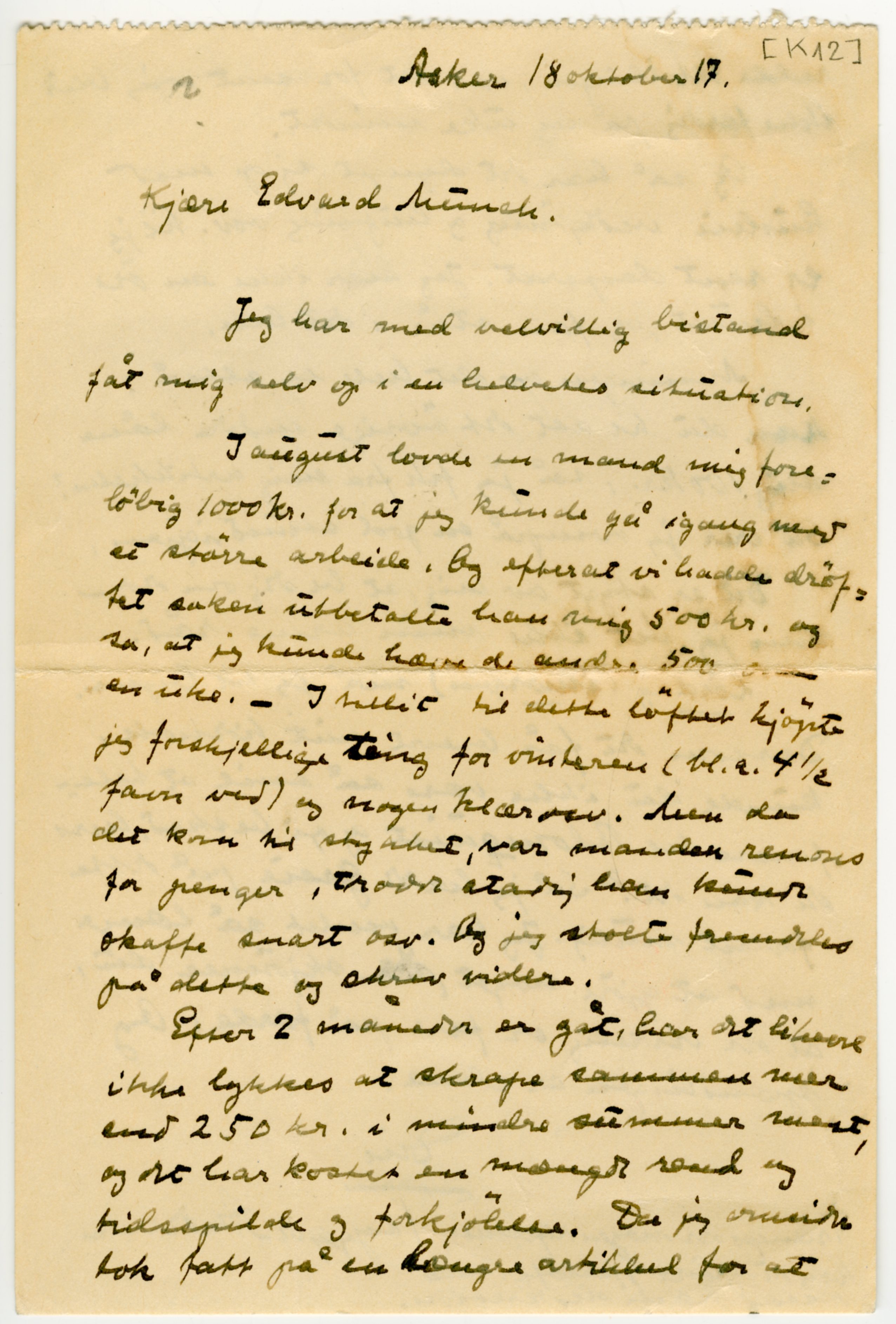 MM K 12, Munchmuseet. Datert 18.10.1917. Brev fra Tryggve Andersen.