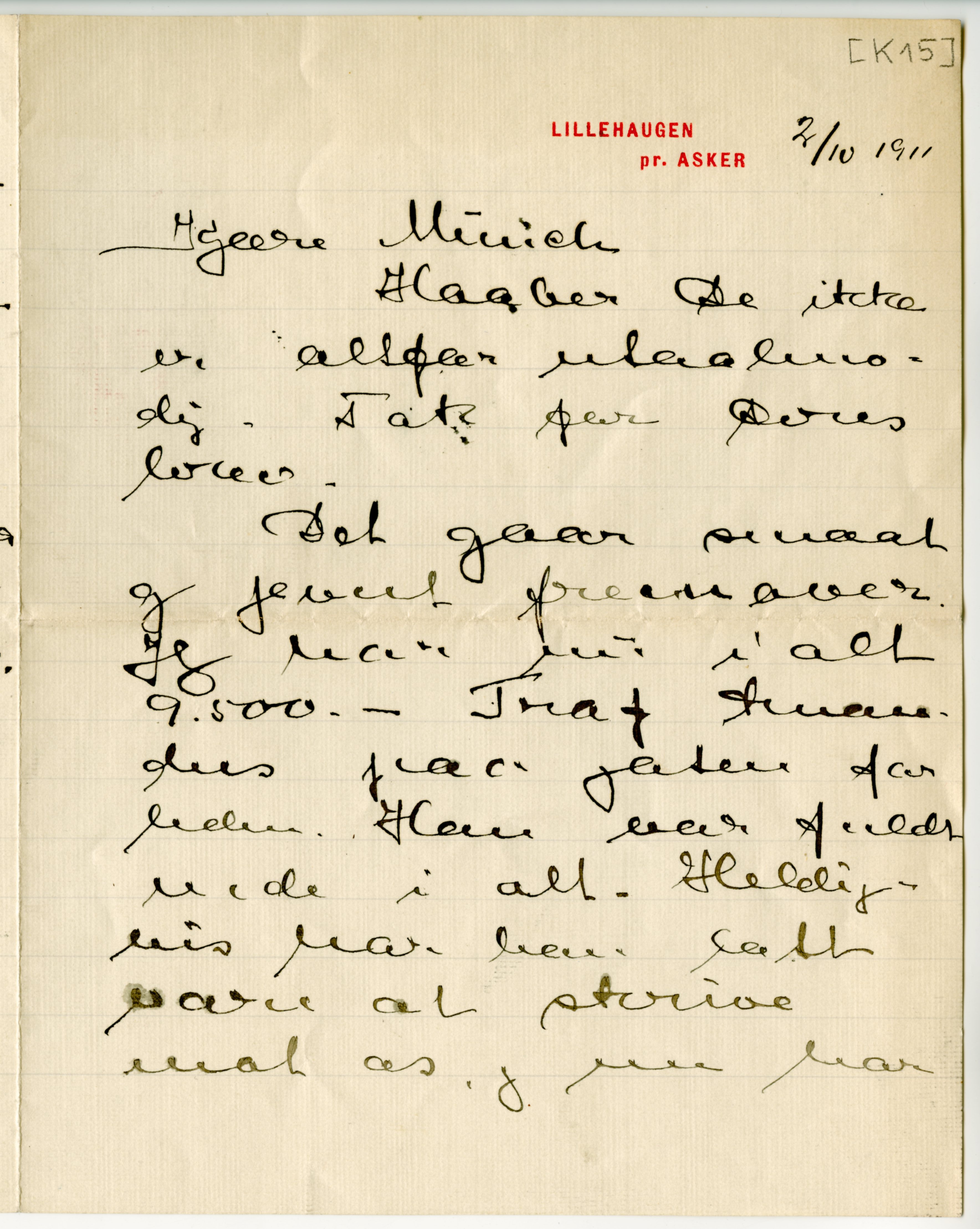 MM K 15, Munchmuseet. Datert 02.10.1911. Brev fra Johan Anker.