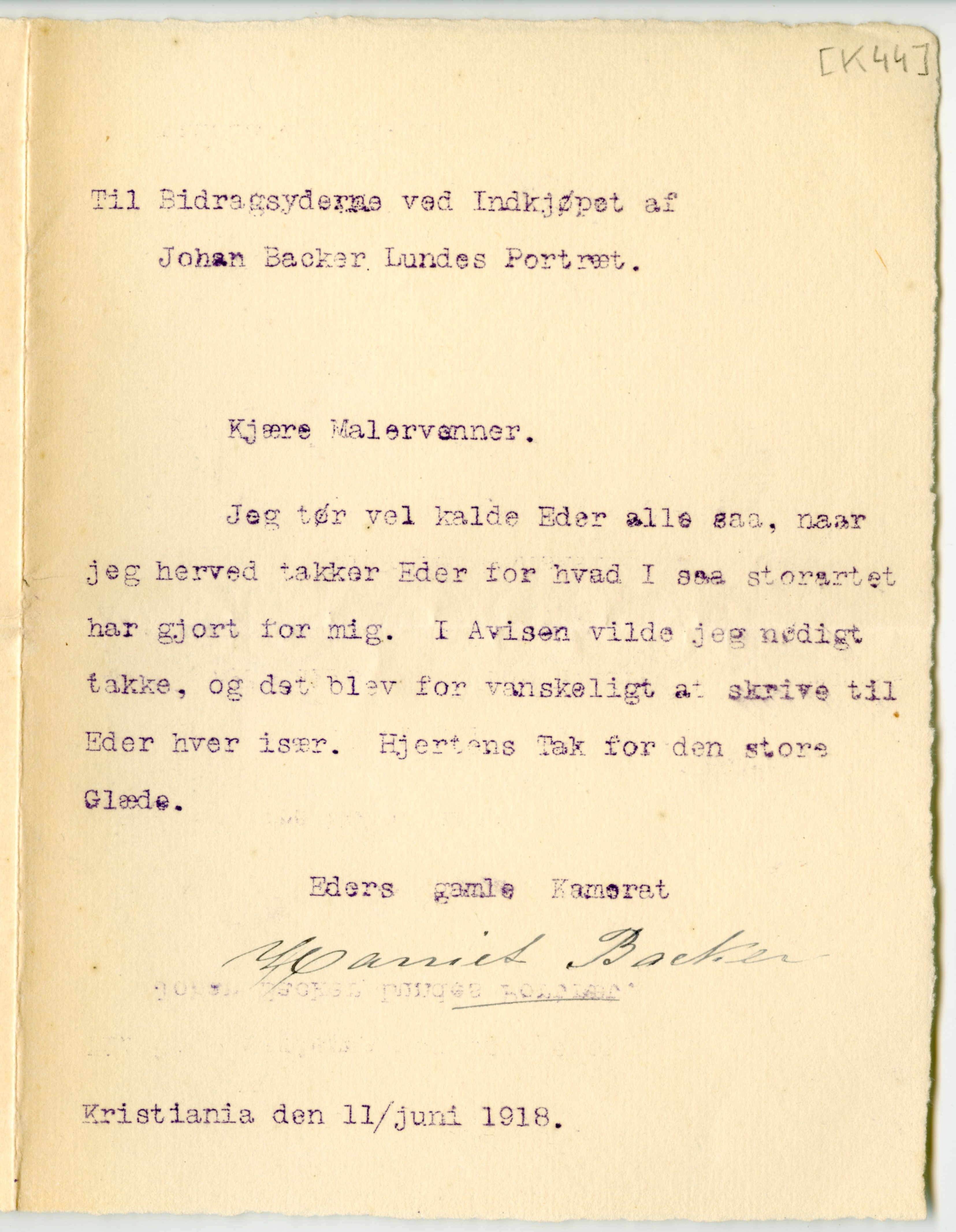 MM K 44, Munchmuseet. Datert 11.06.1918. Brev fra Harriet Backer.