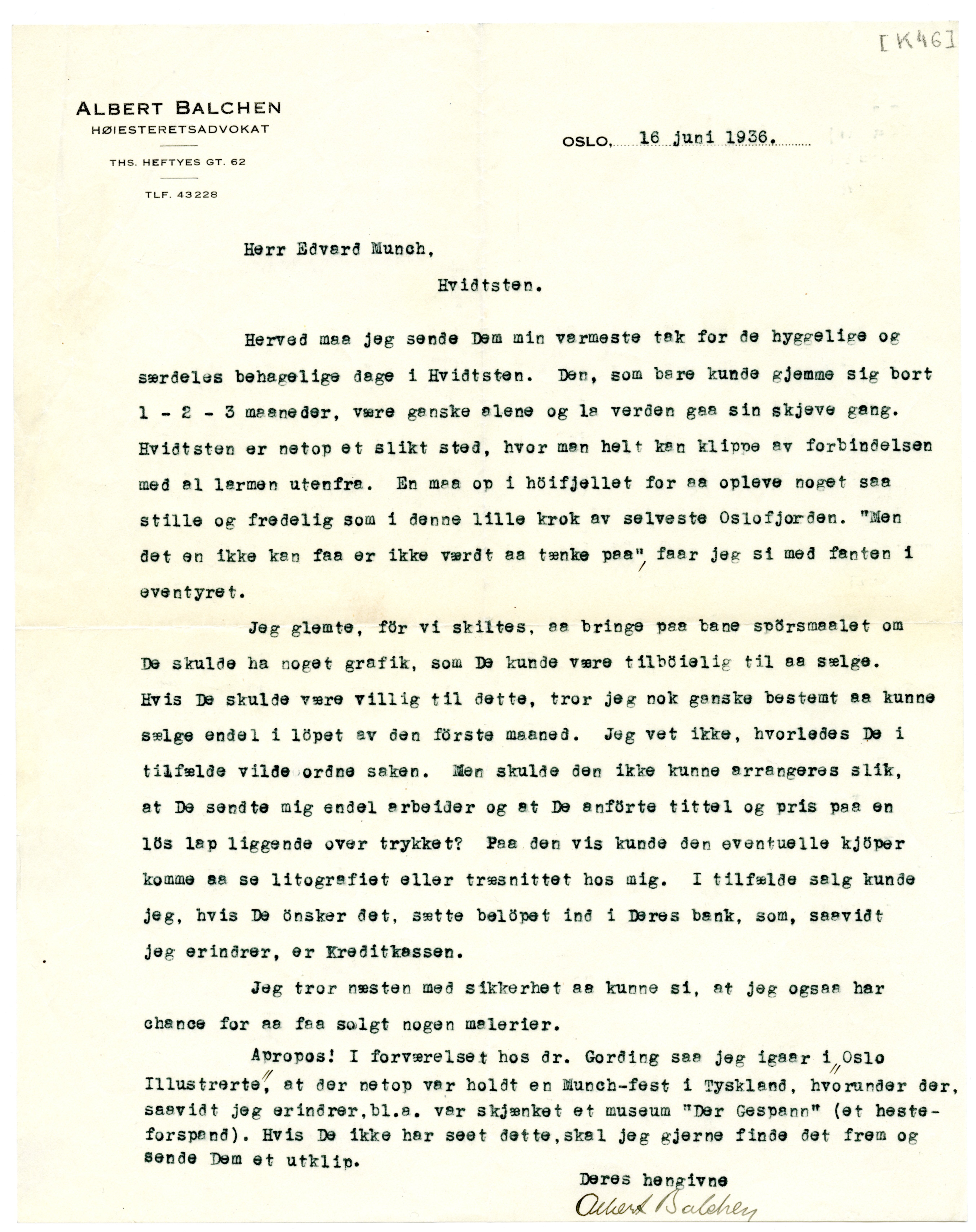MM K 46, Munchmuseet. Datert 16.06.1936. Brev fra Albert Balchen.