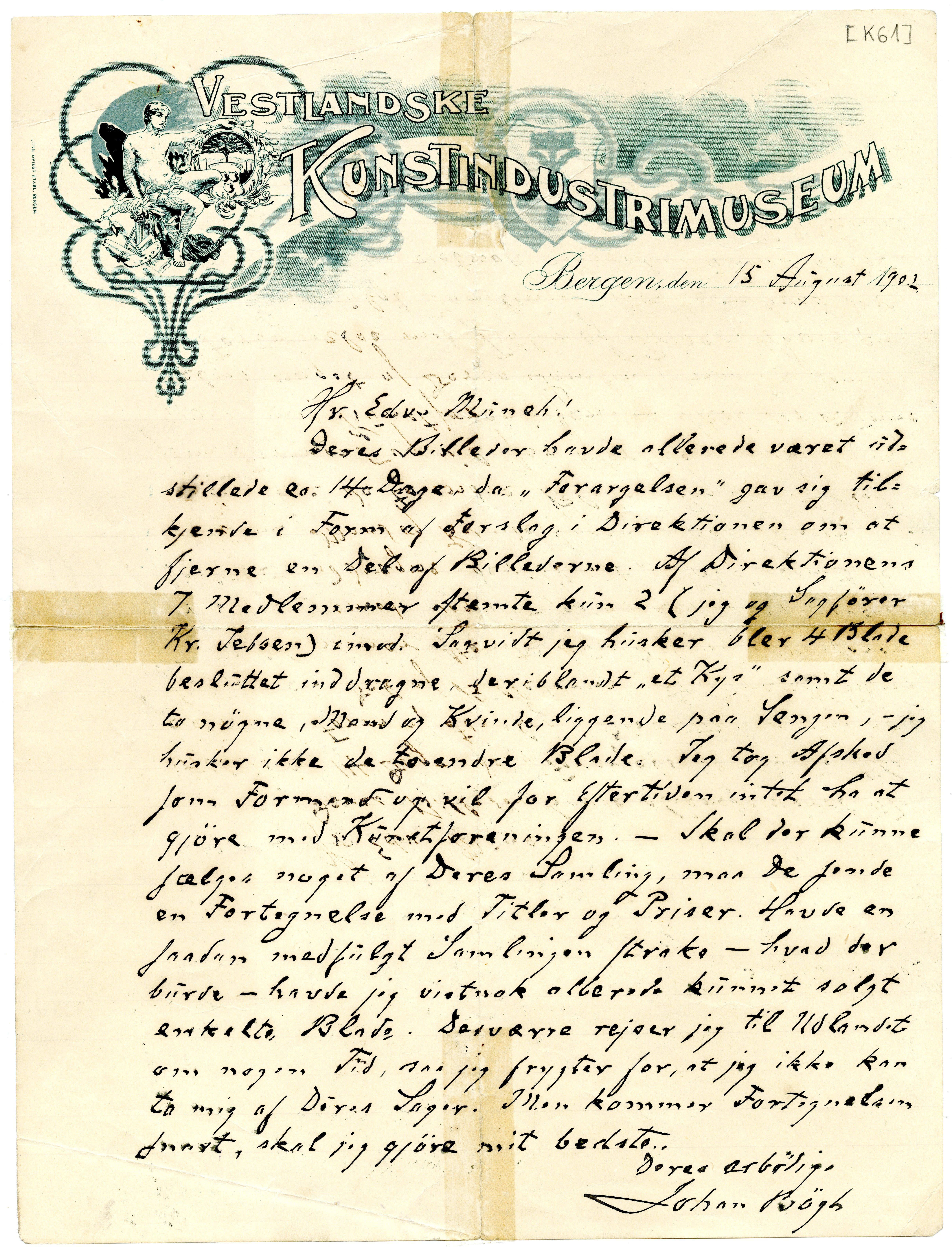 MM K 61, Munchmuseet. Datert 12.08.1902. Brev fra Johan Bøgh, Vestlandske Kunstindustrimuseum.