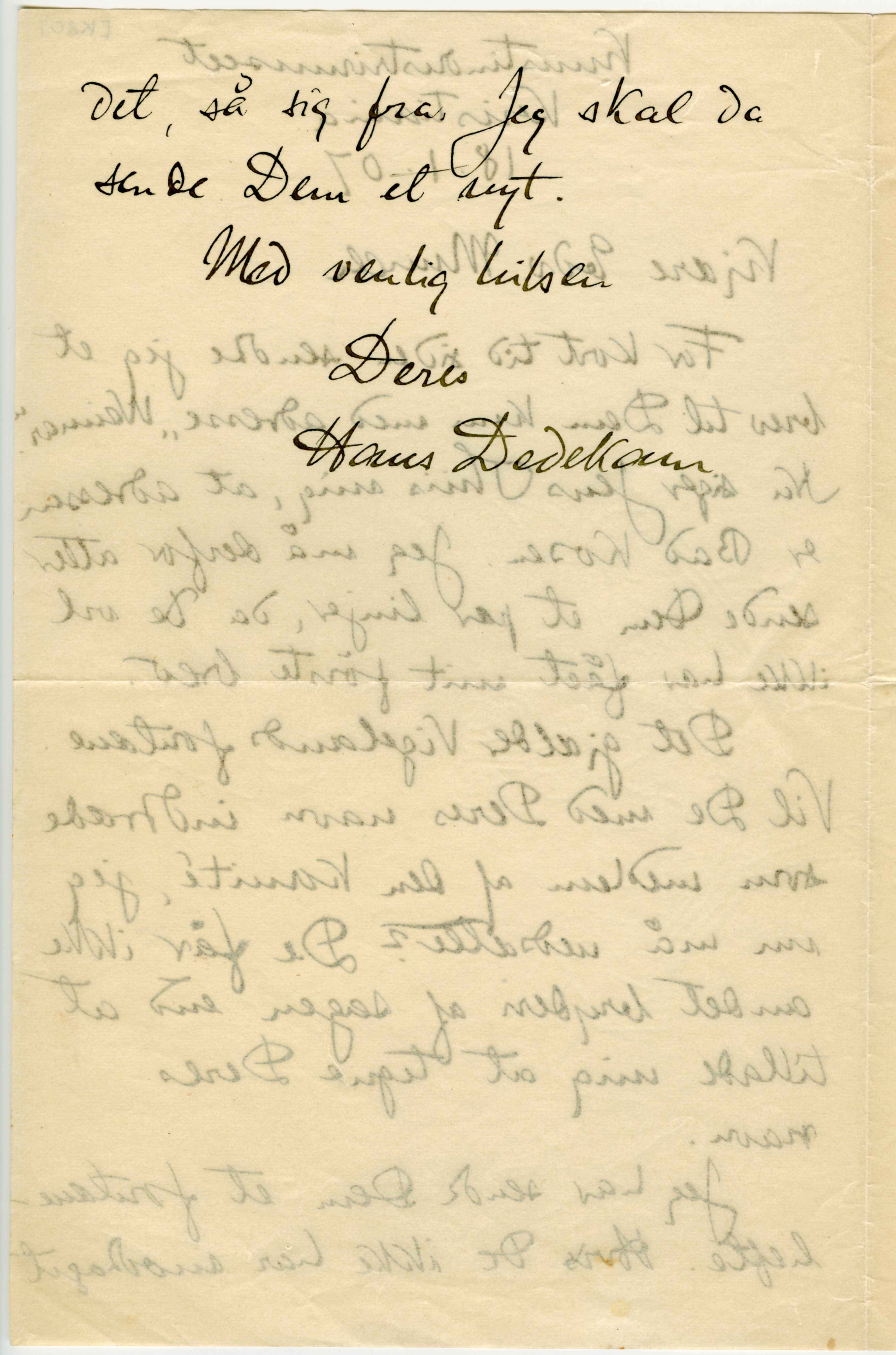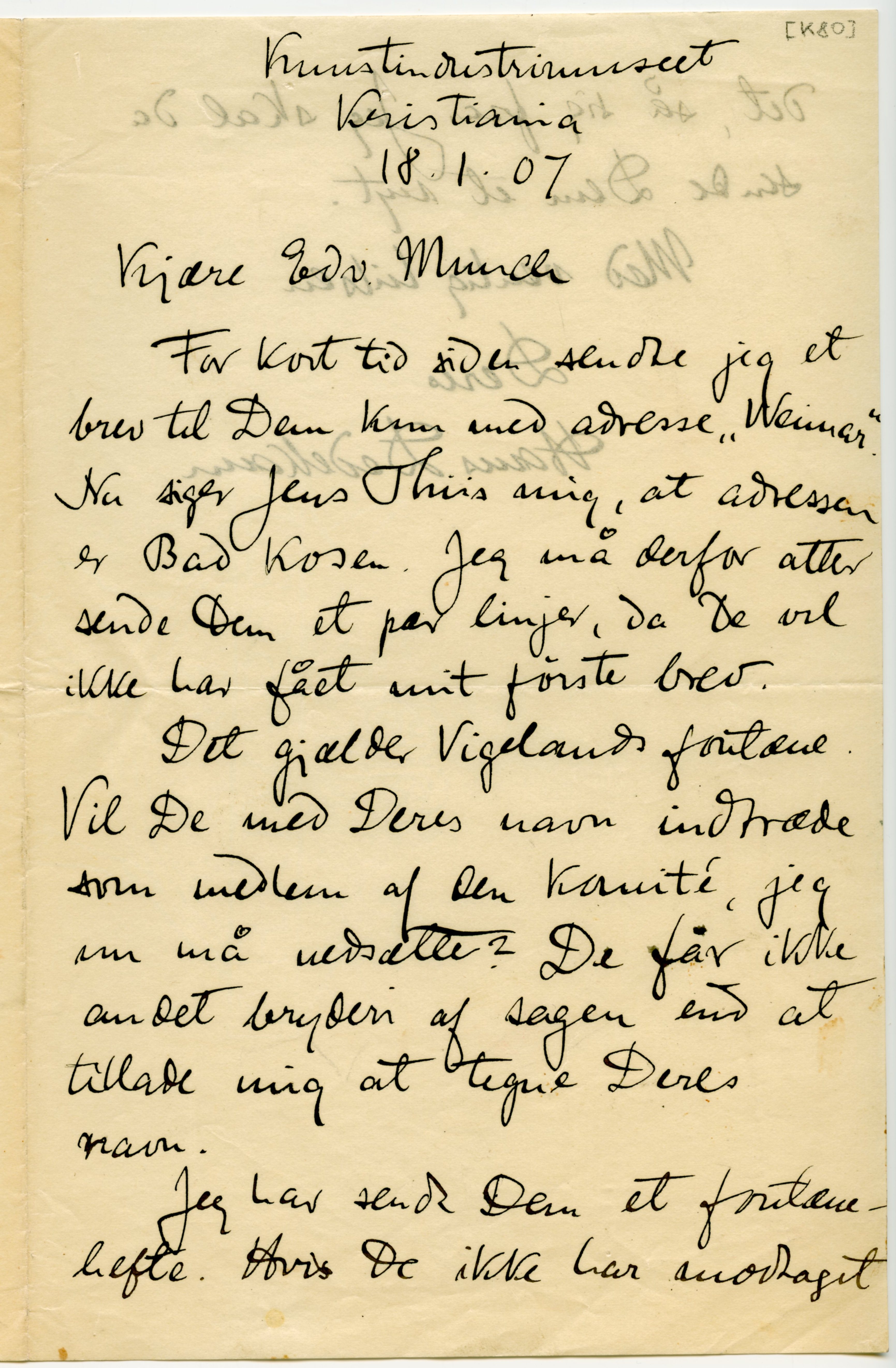 MM K 80, Munchmuseet. Datert 18.01.1907. Brev fra Hans Dedekam, Kunstindustrimuseet i Oslo.