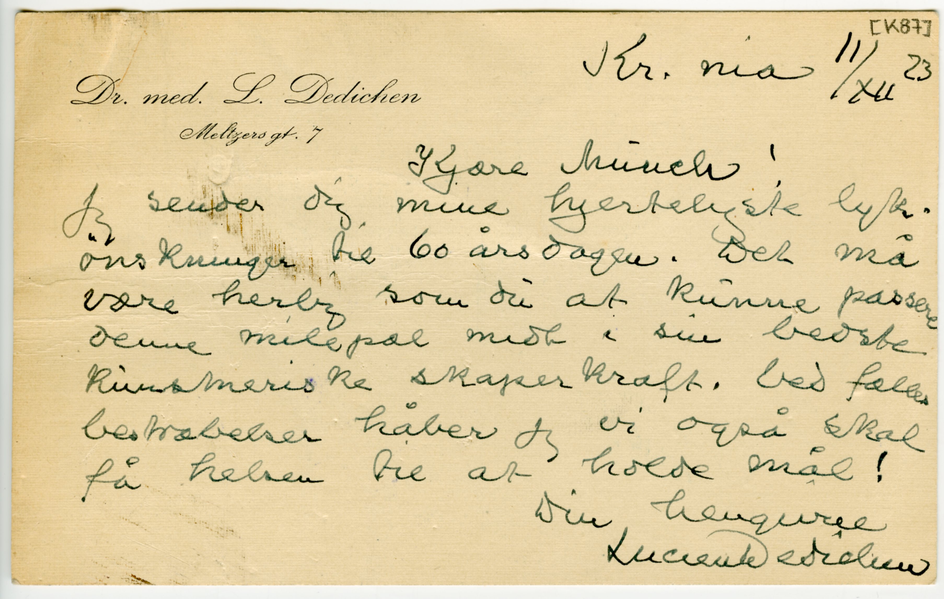 MM K 87, Munchmuseet. Datert 11.12.1923. Brev fra Lucien Dedichen.