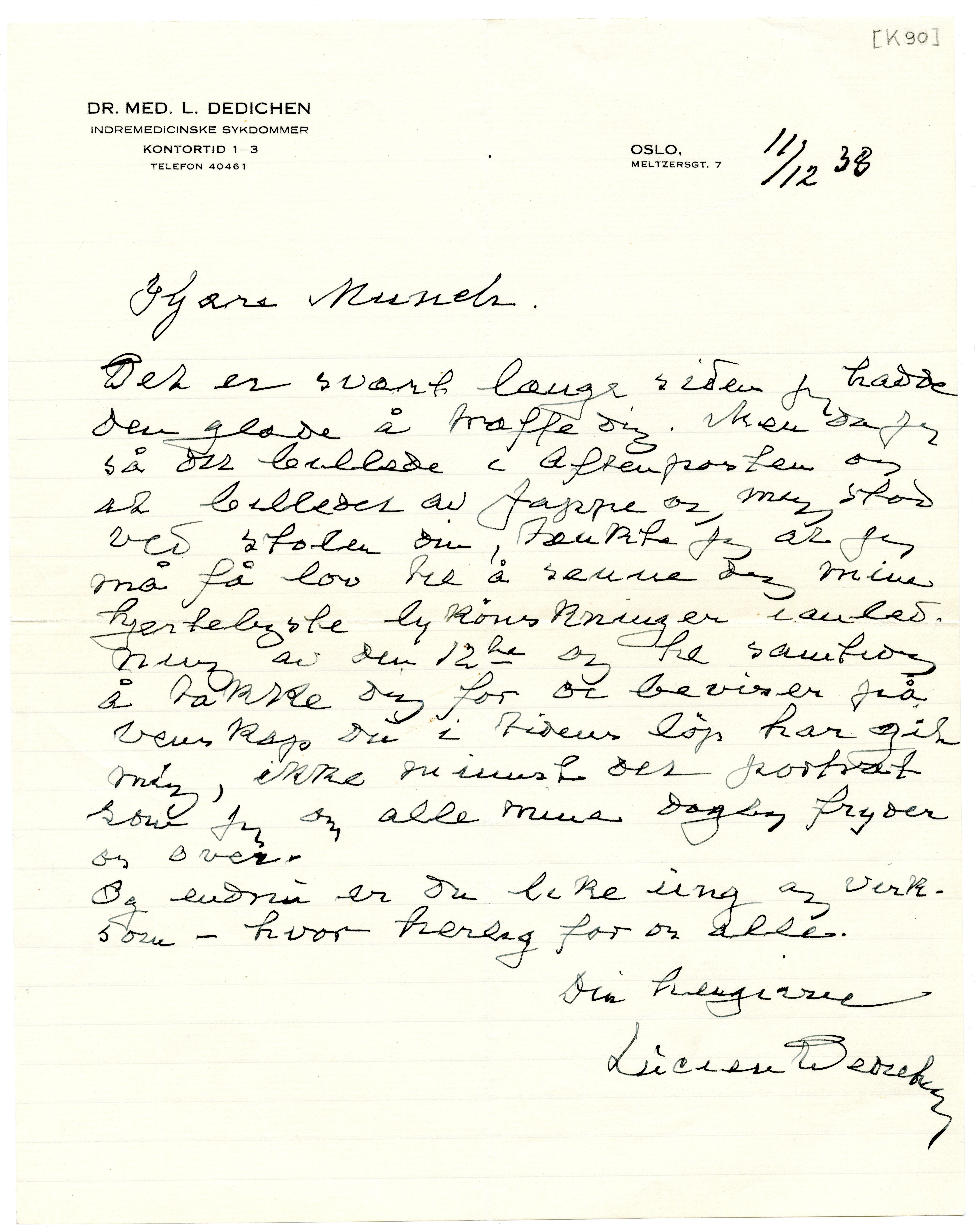 MM K 90, Munchmuseet. Datert 11.12.1938. Brev fra Lucien Dedichen.