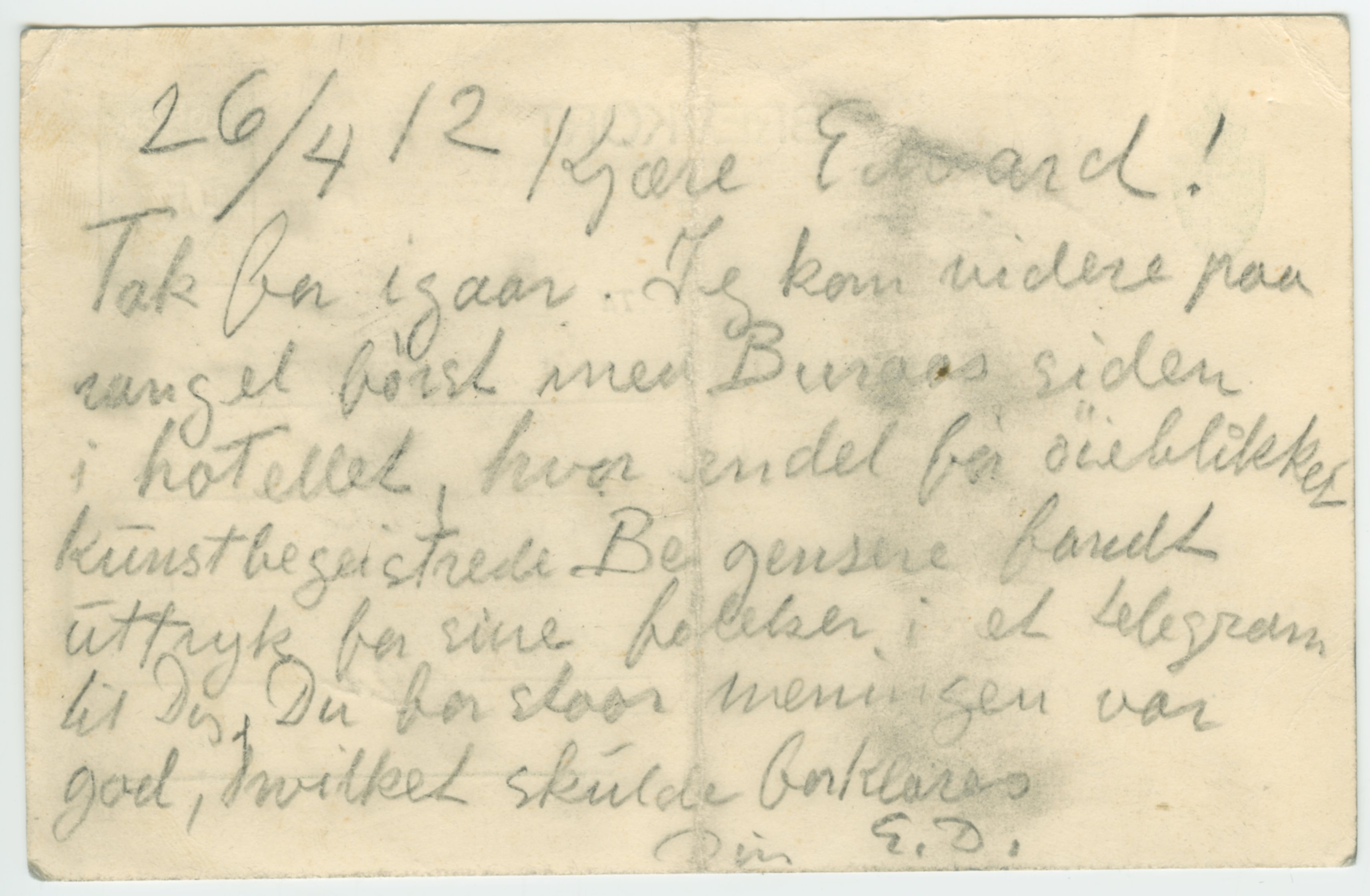 MM K 102, Munchmuseet. Datert 26.04.1912. Brev fra Edvard Diriks.