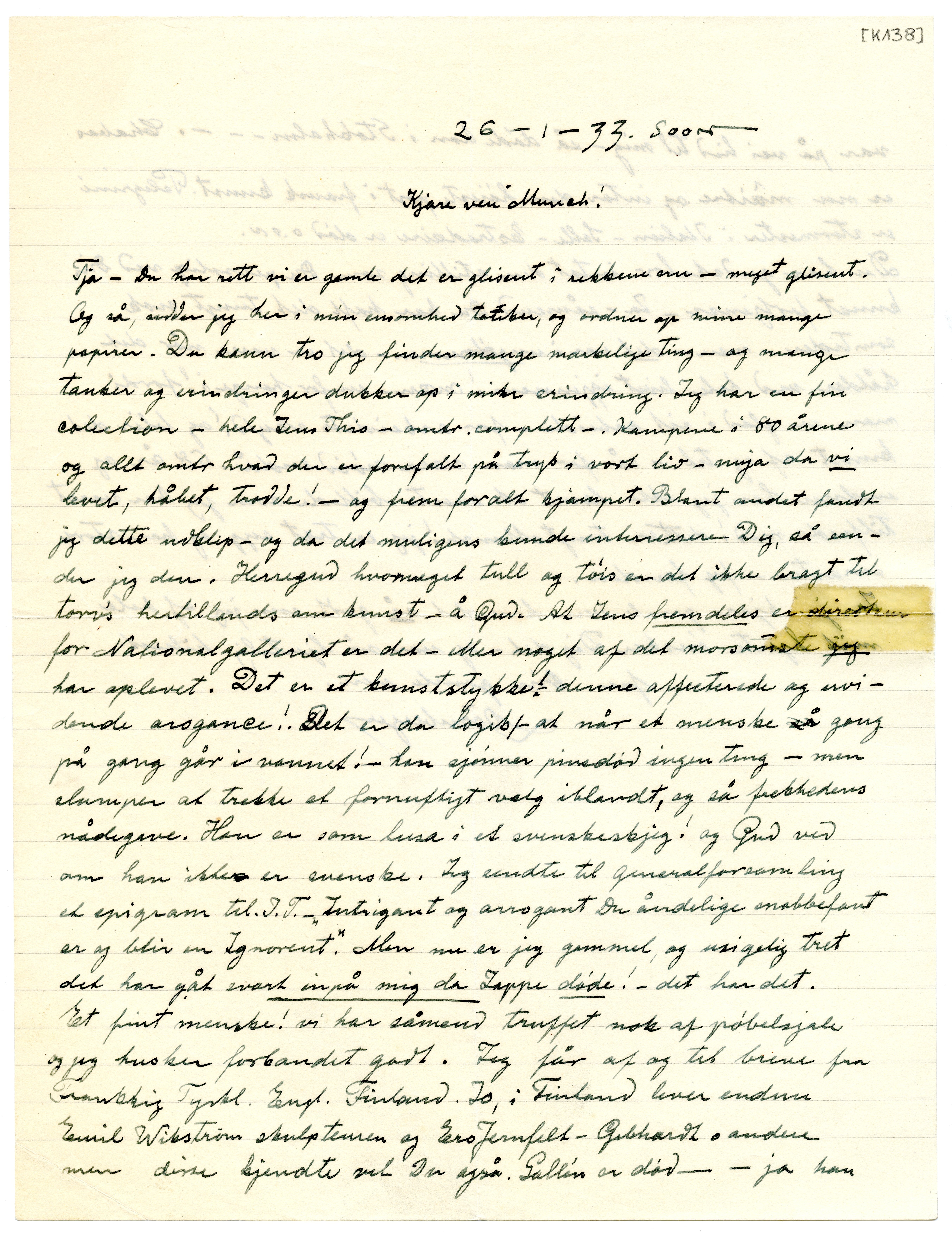 MM K 138, Munchmuseet. Datert 26.01.1933. Brev fra Carl Dørnberger.