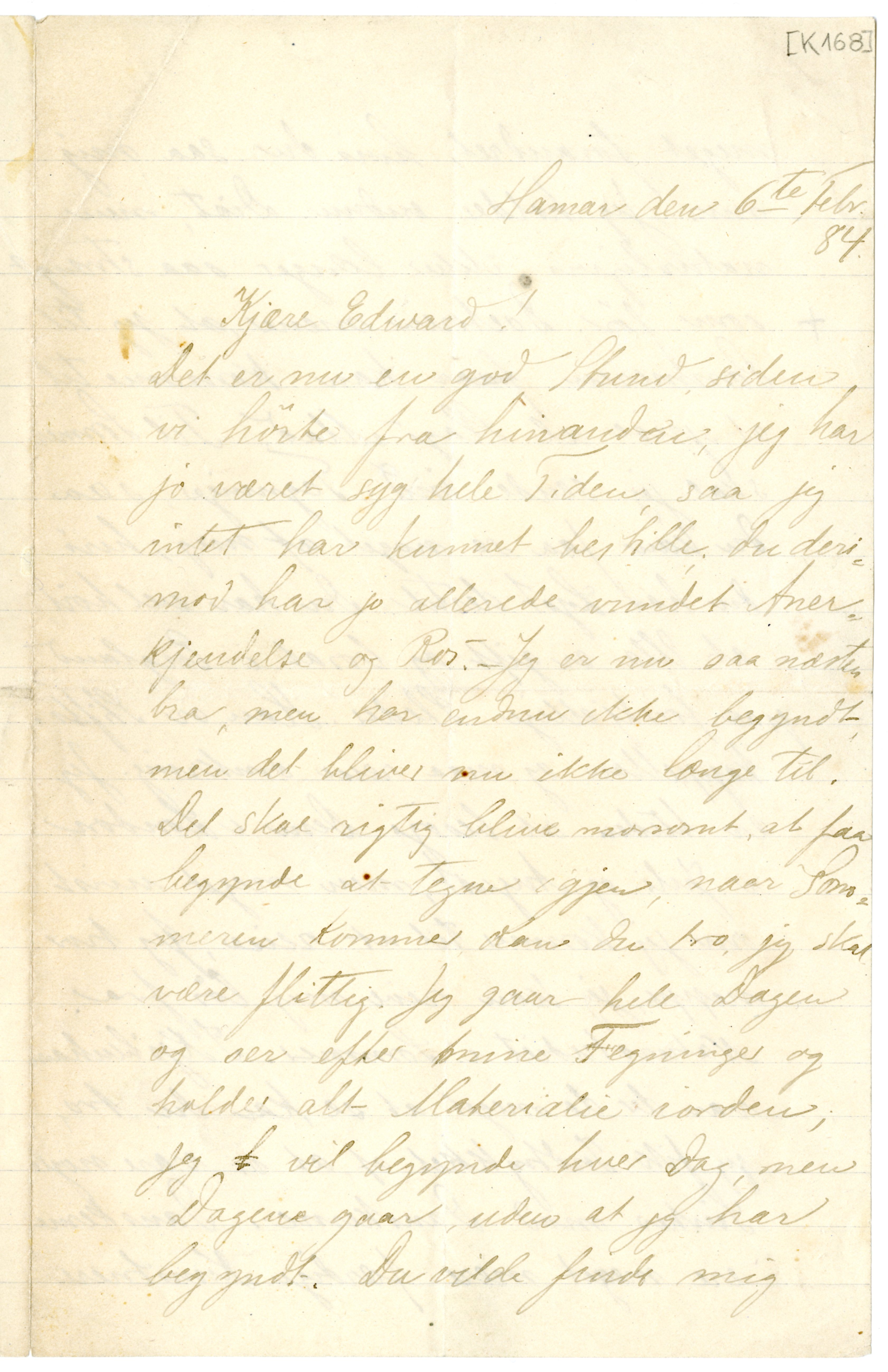 MM K 168, Munchmuseet. Datert 06.02.1884. Brev fra Bjarne Falk.