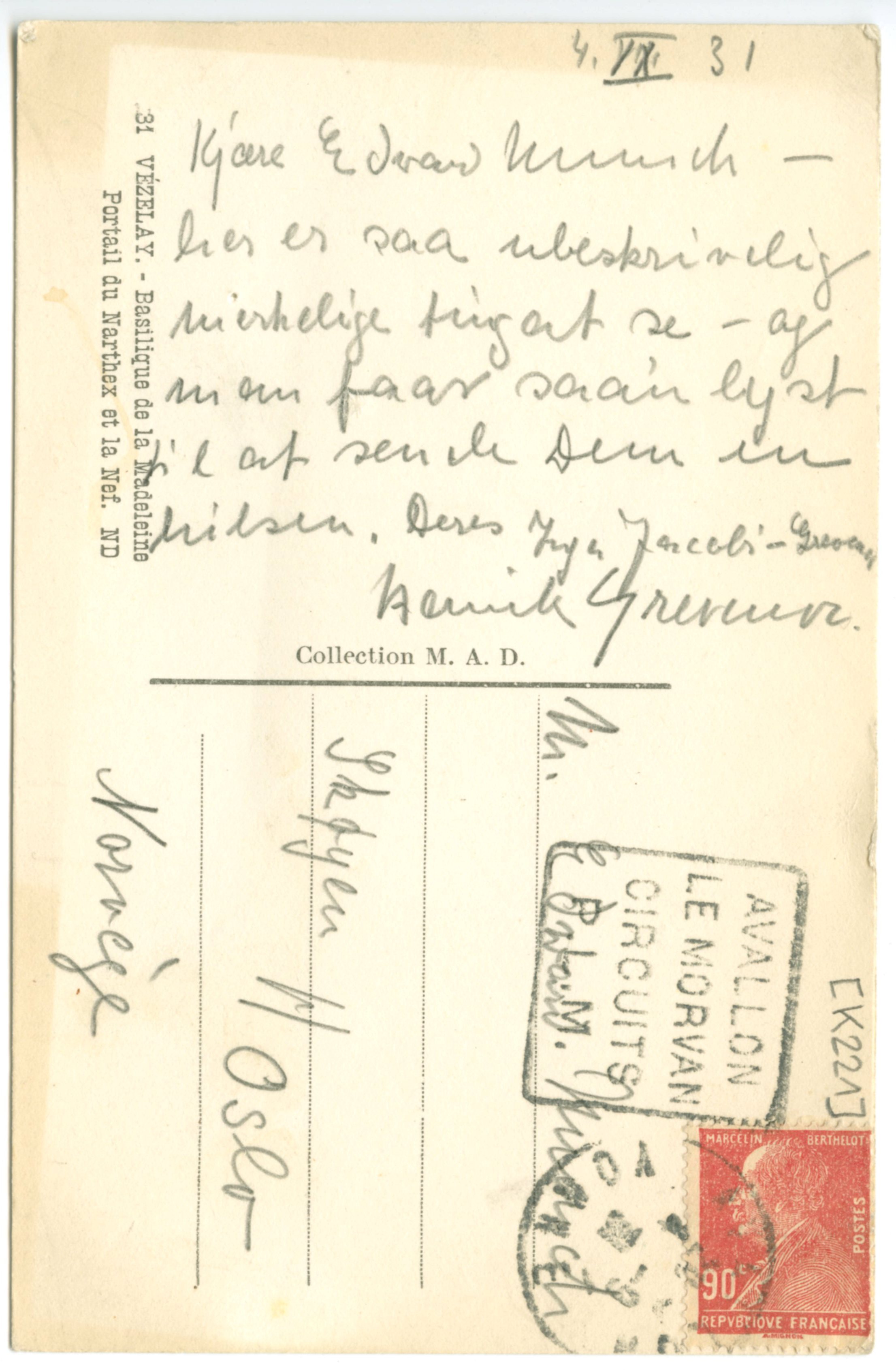 MM K 221, Munchmuseet. Datert 04.09.1931. Brev fra Henrik Grevenor.