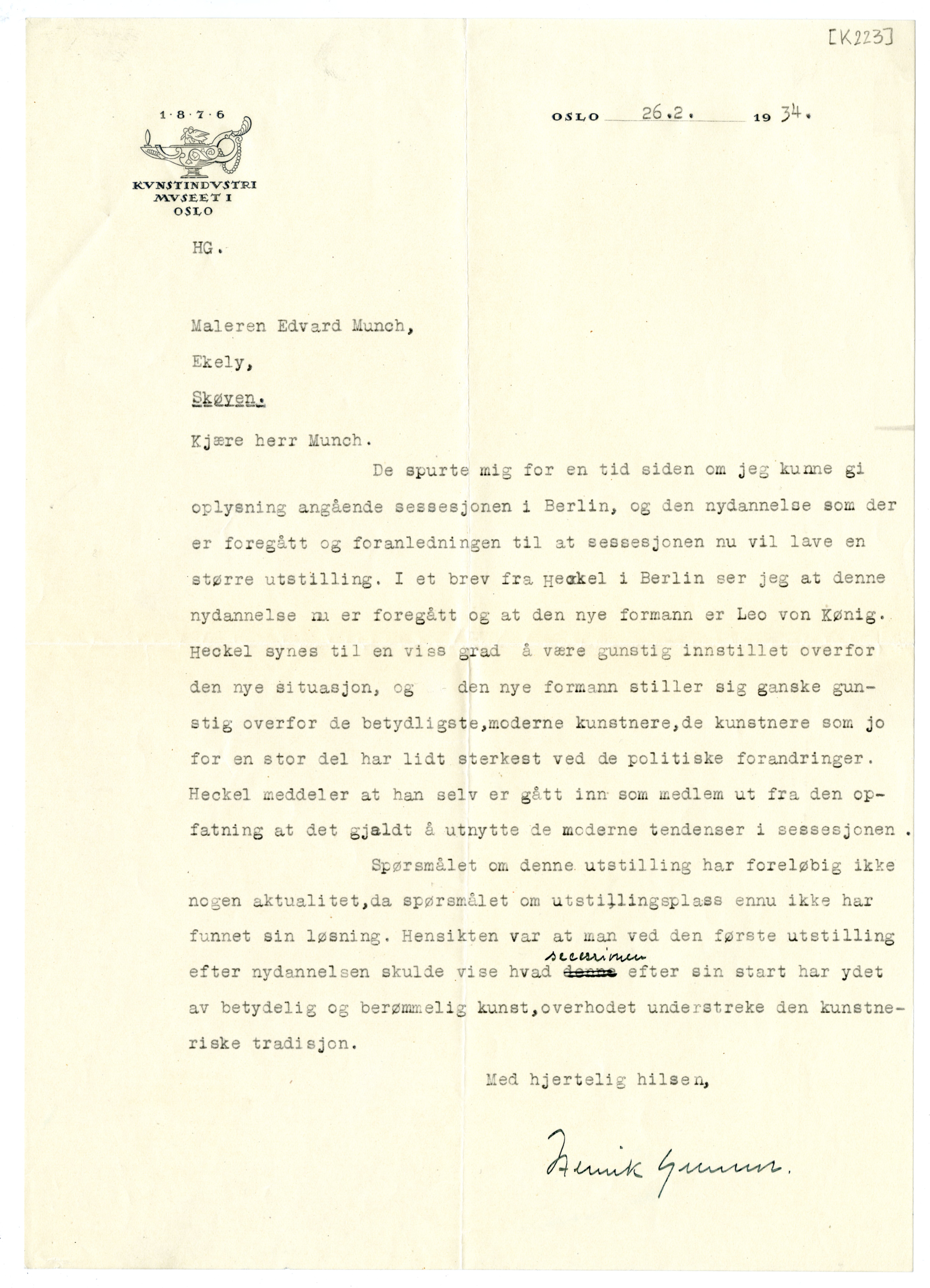 MM K 223, Munchmuseet. Datert 26.02.1934. Brev fra Henrik Grevenor, Kunstindustrimuseet i Oslo.