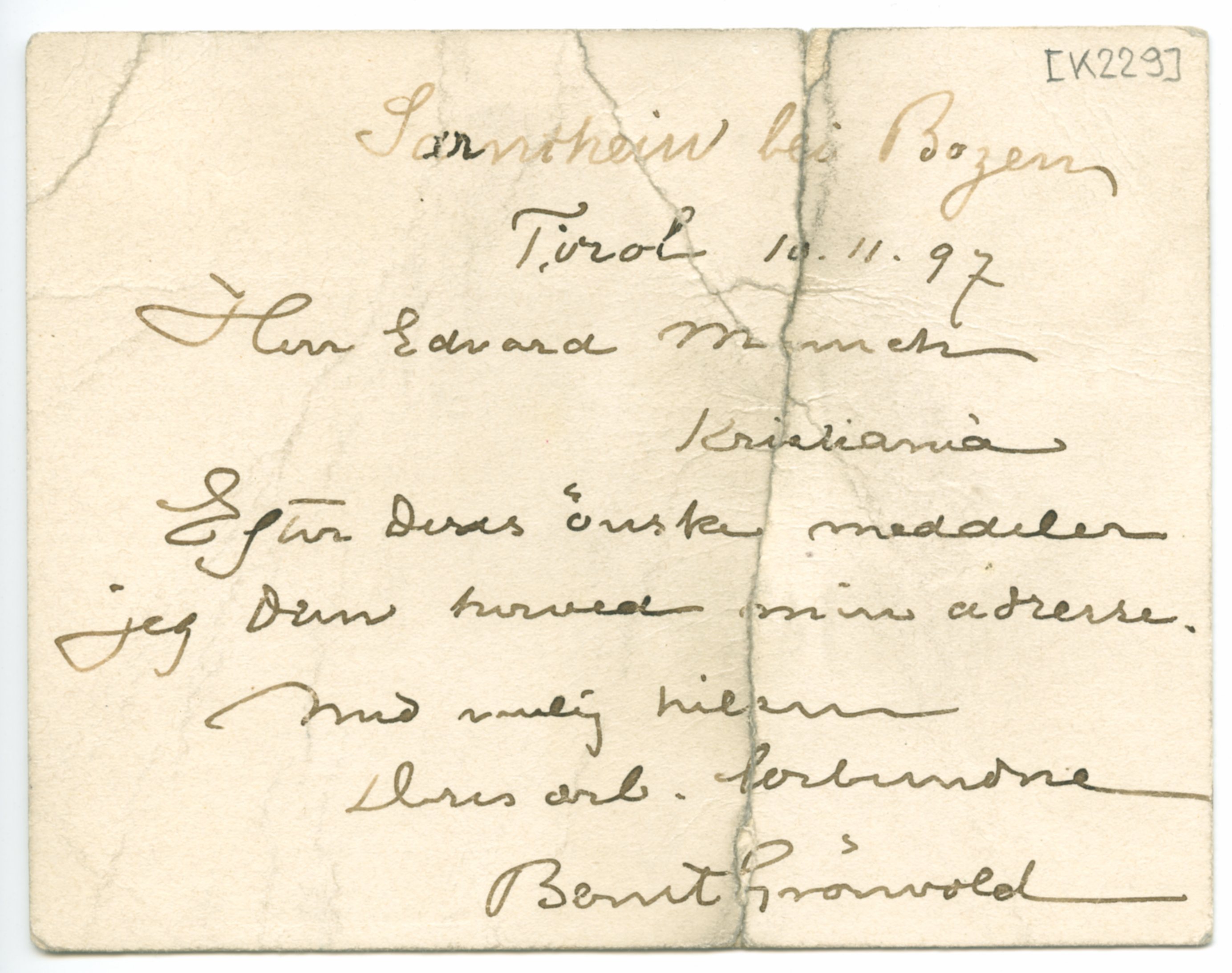 MM K 229, Munchmuseet. Datert 10.11.1897. Brev fra Bernt Grønvold.
