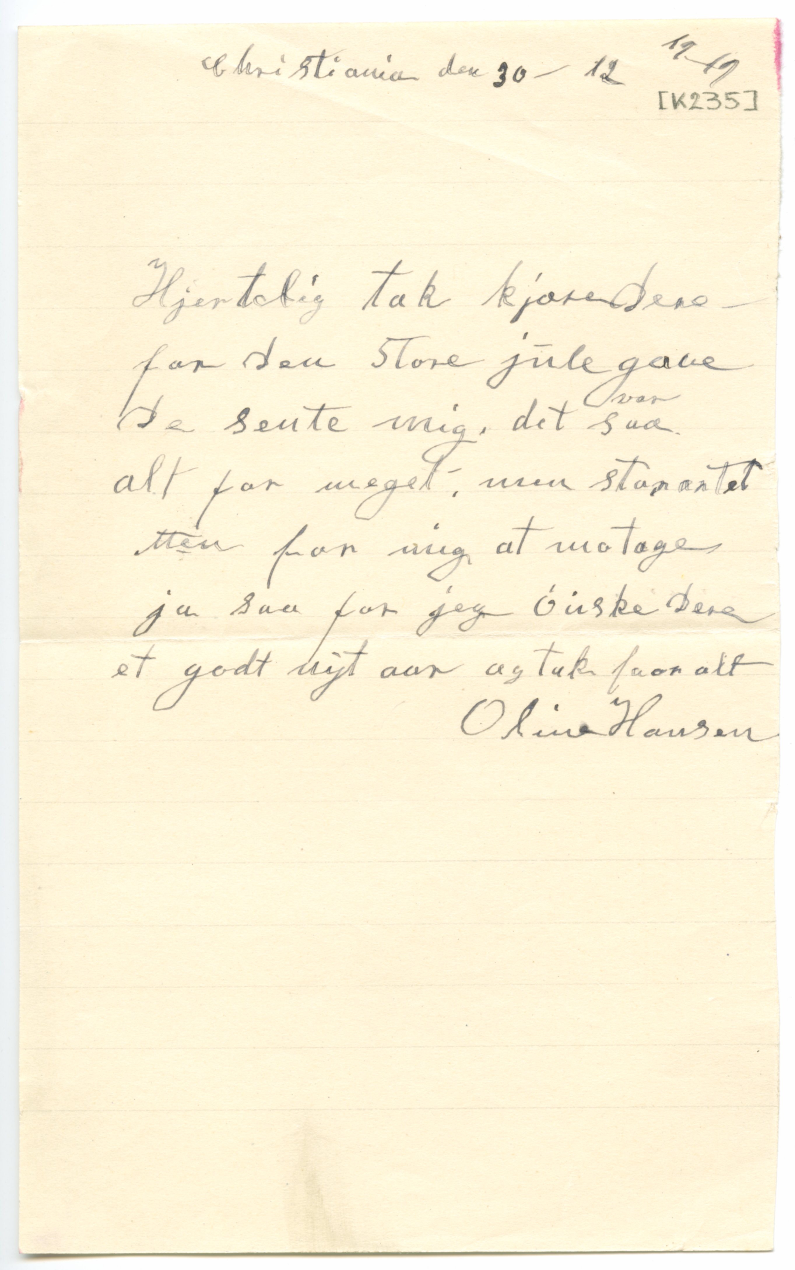MM K 235, Munchmuseet. Datert 30.12.1919. Brev fra Oline Hansen.