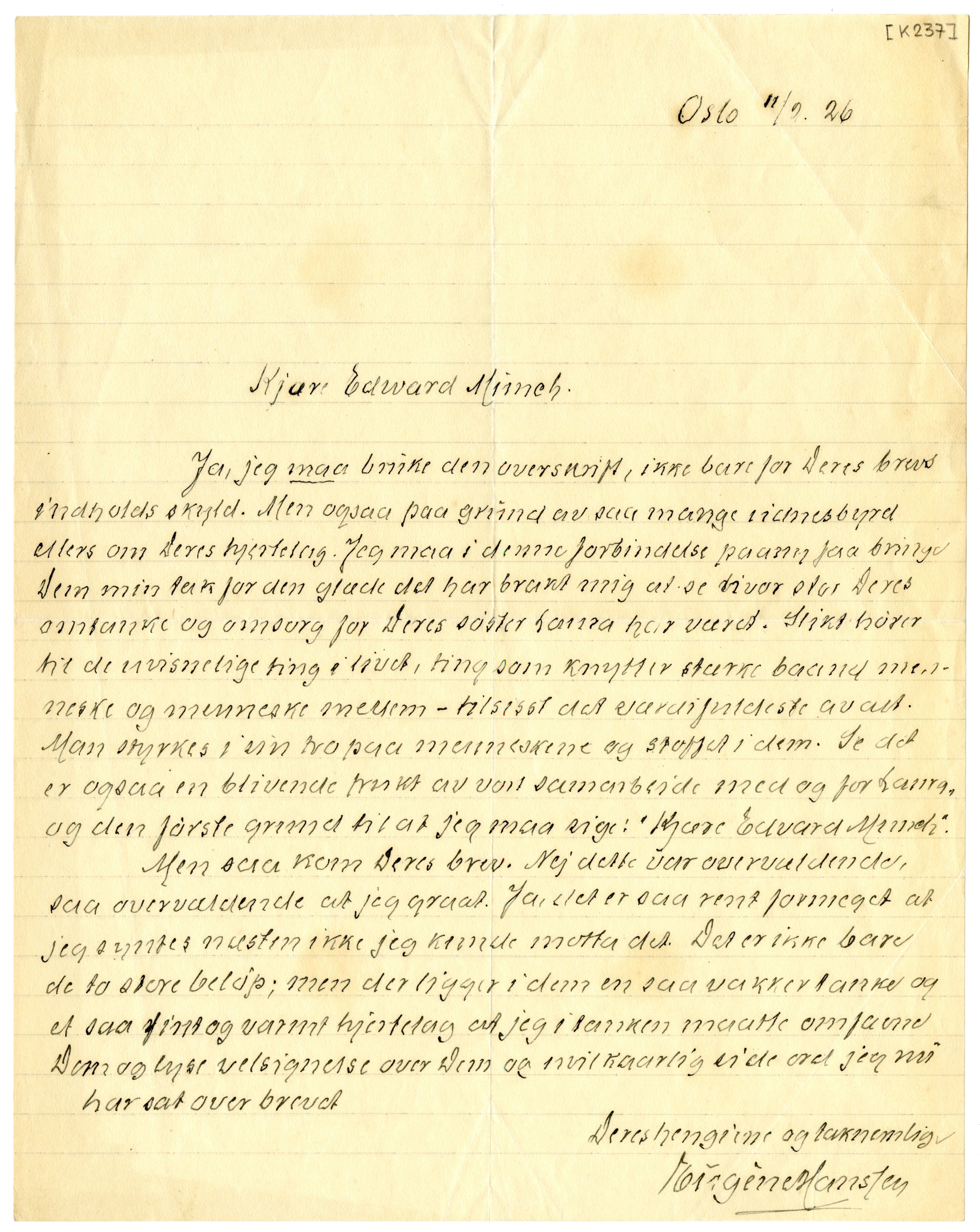 MM K 237, Munchmuseet. Datert 11.02.1926. Brev fra Eugéne Hanssen.