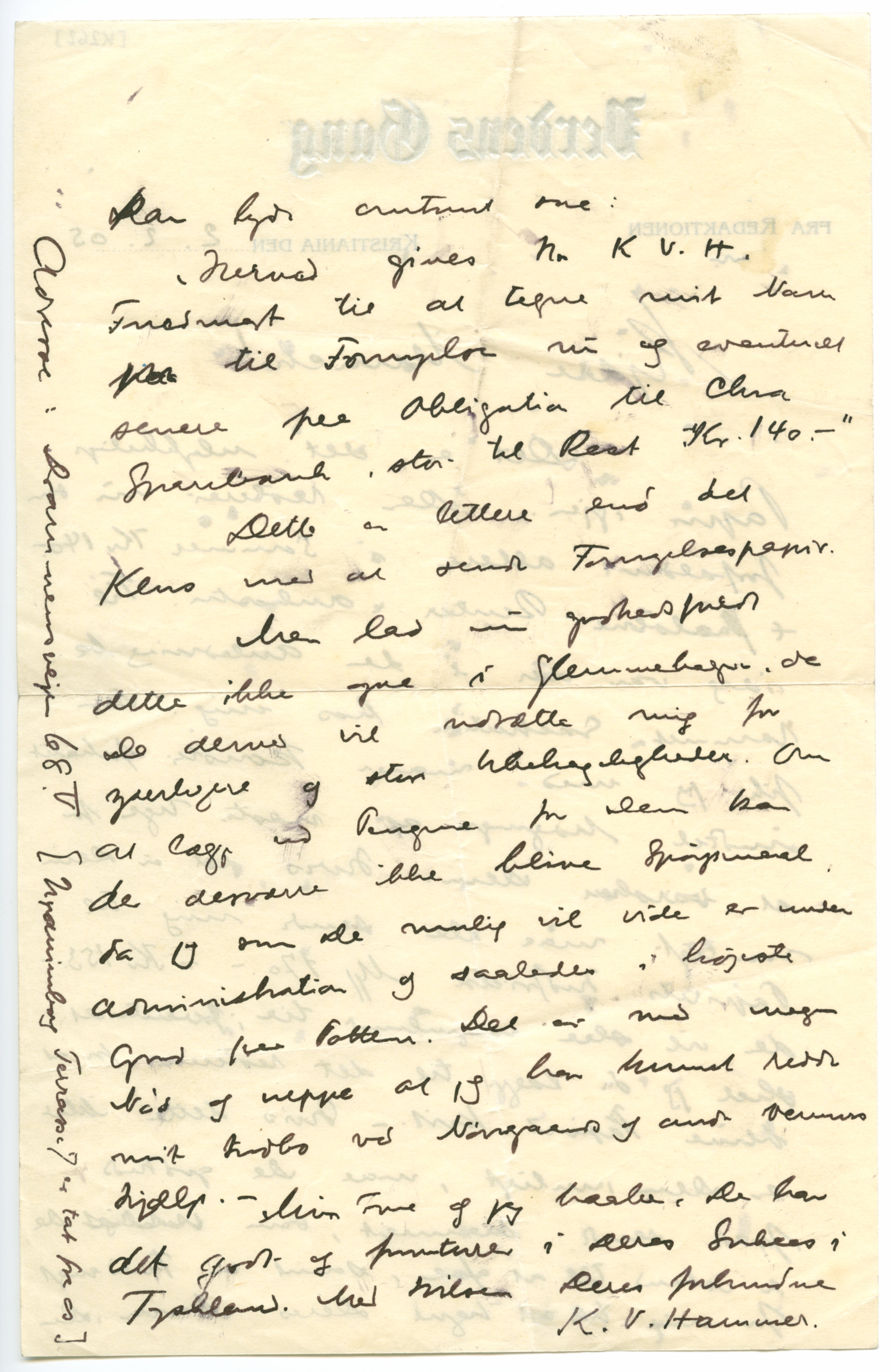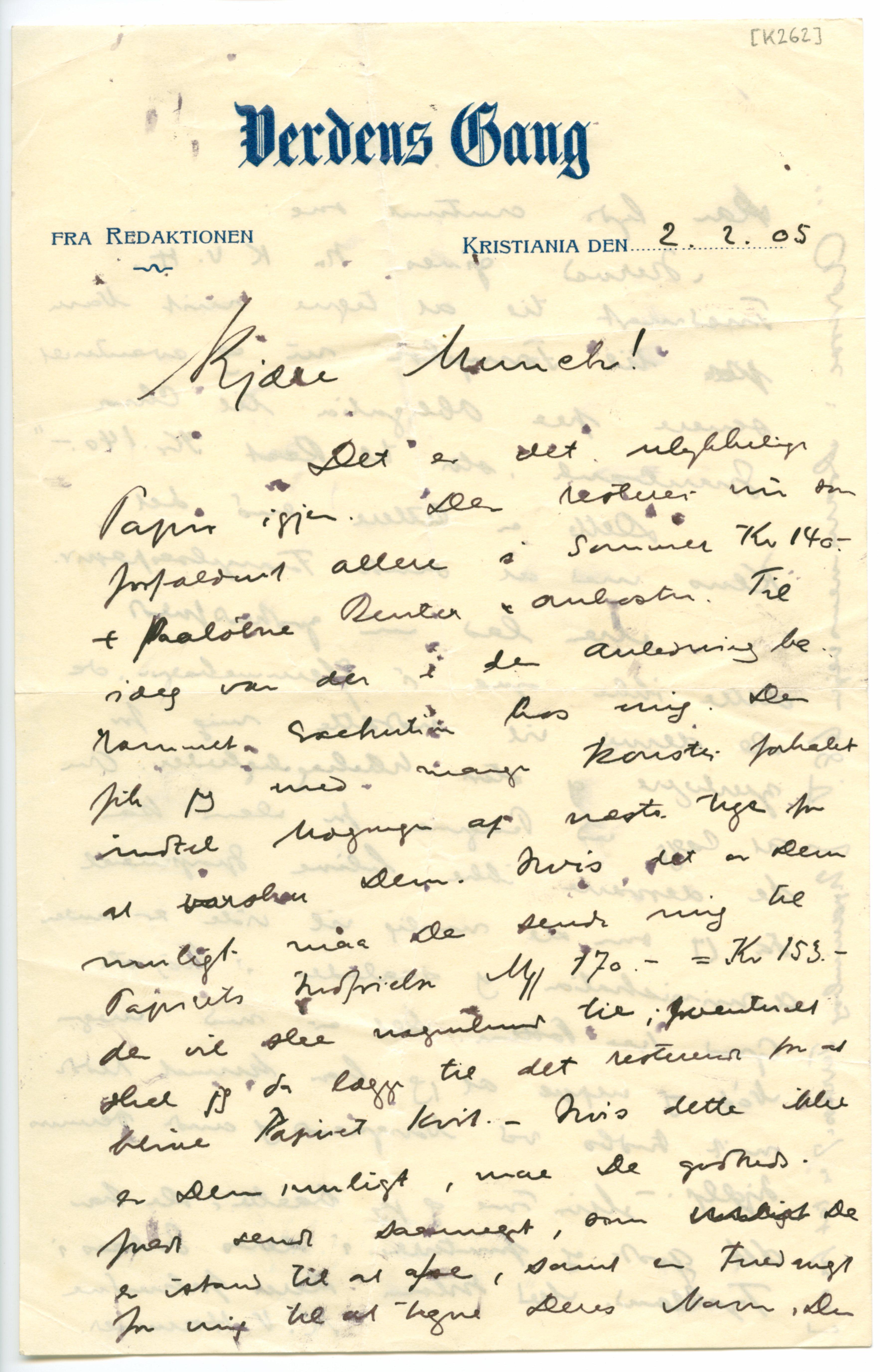 MM K 262, Munchmuseet. Datert 02.02.1905. Brev fra Karl Vilhelm Hammer, Verdens Gang.