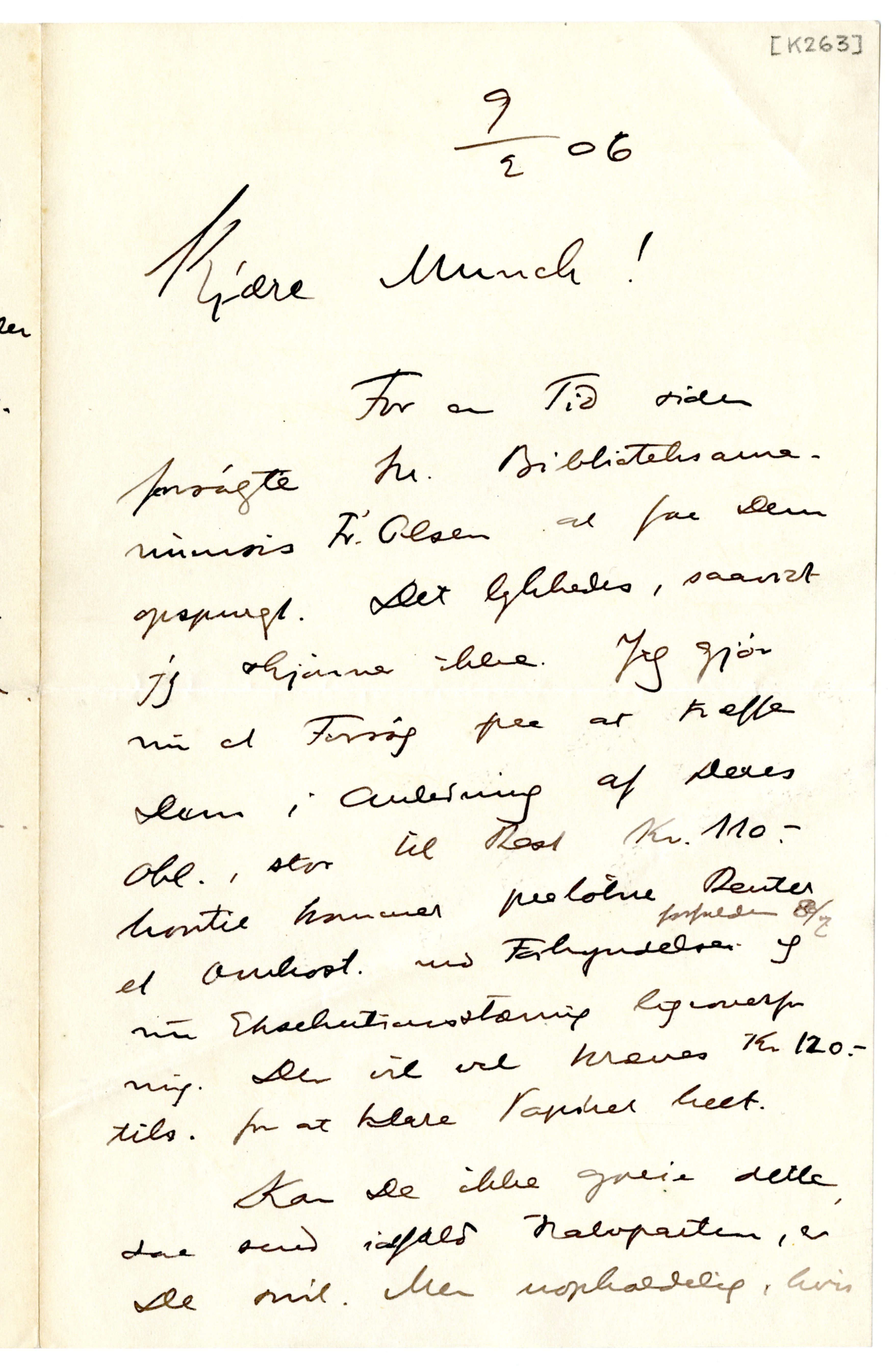 MM K 263, Munchmuseet. Datert 09.02.1906. Brev fra Karl Vilhelm Hammer.
