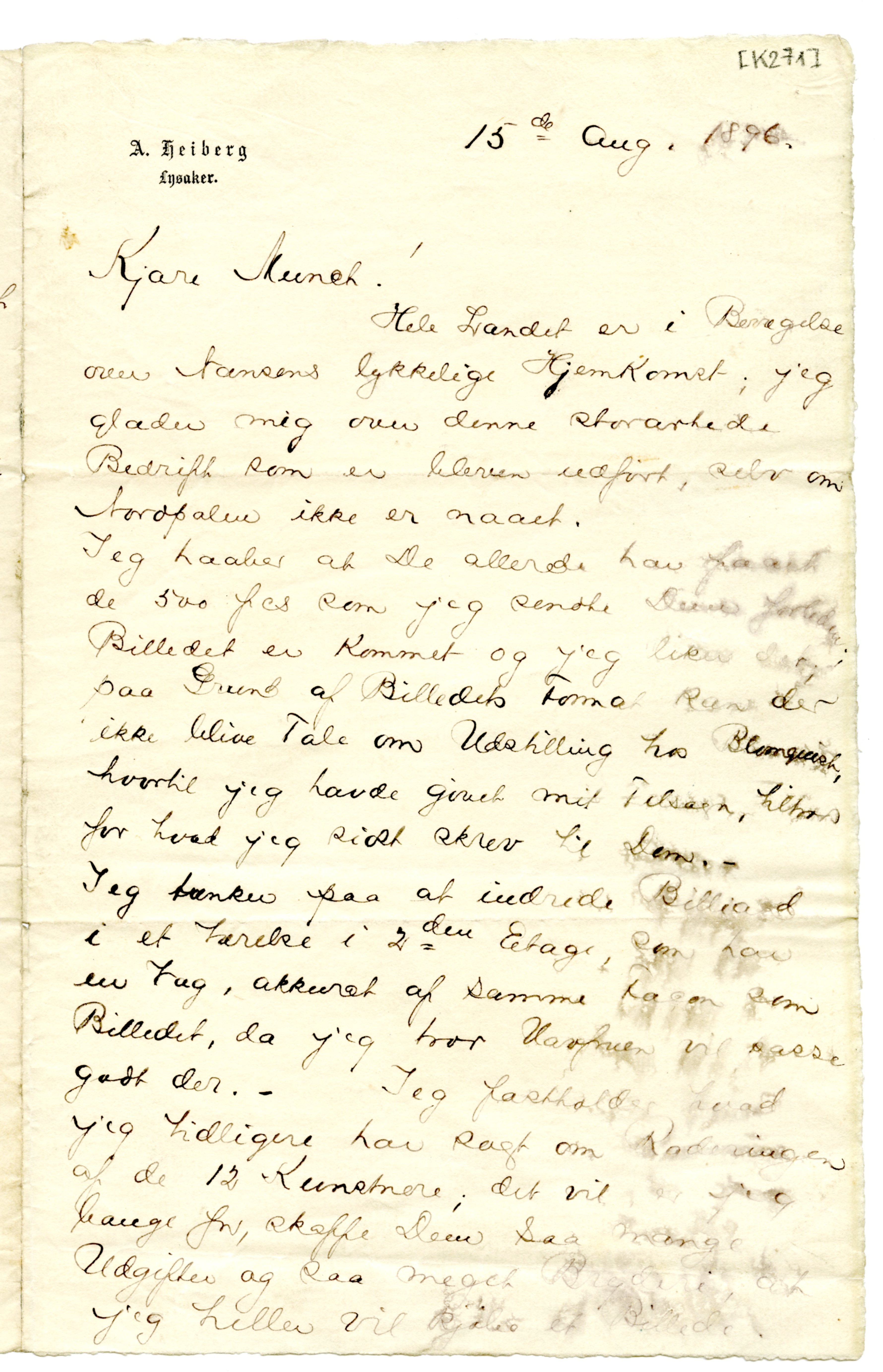 MM K 271, Munchmuseet. Datert 15.08.1896. Brev fra Axel Heiberg.