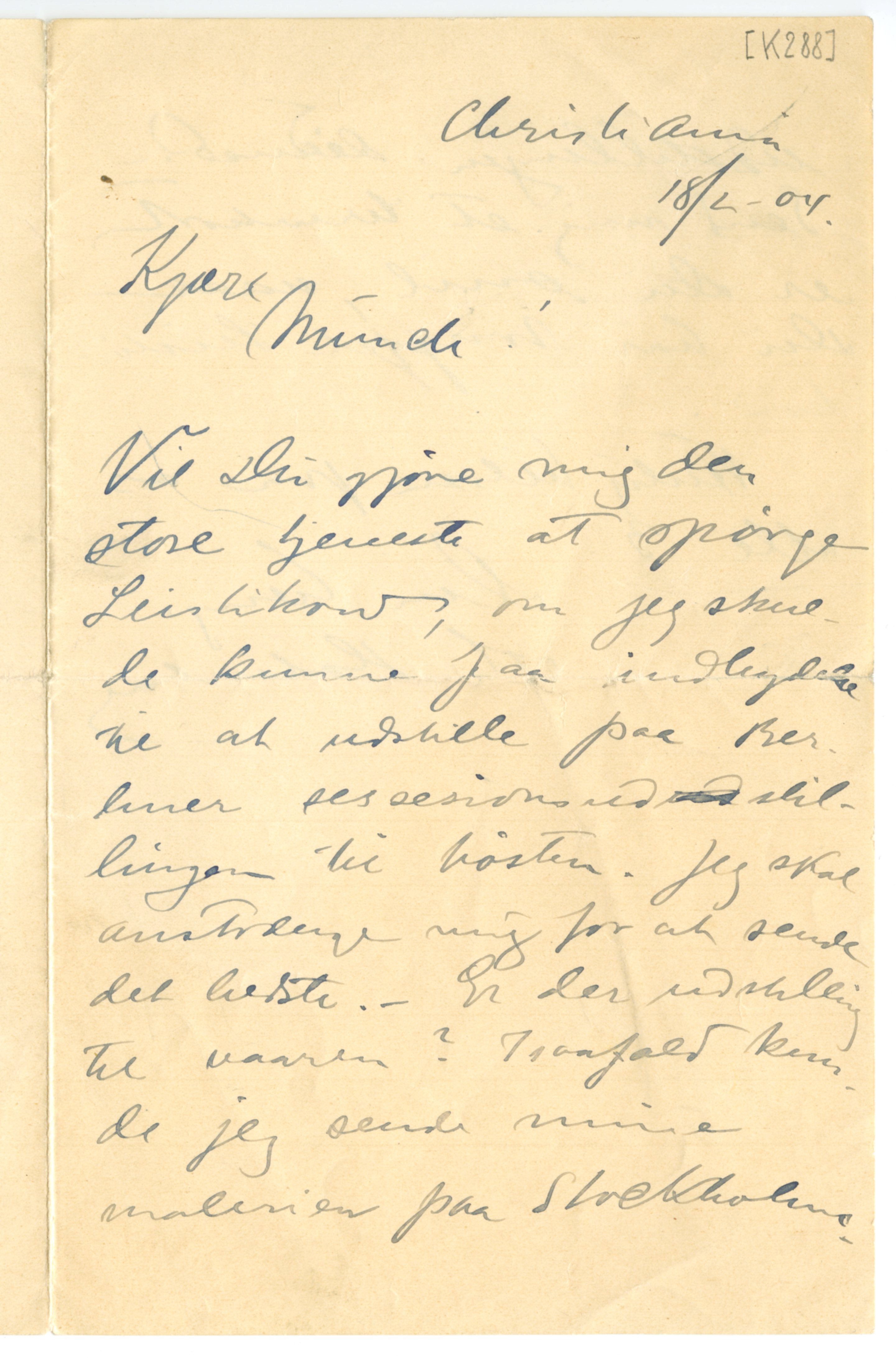 MM K 288, Munchmuseet. Datert 18.02.1904. Brev fra Thorolf Holmboe.