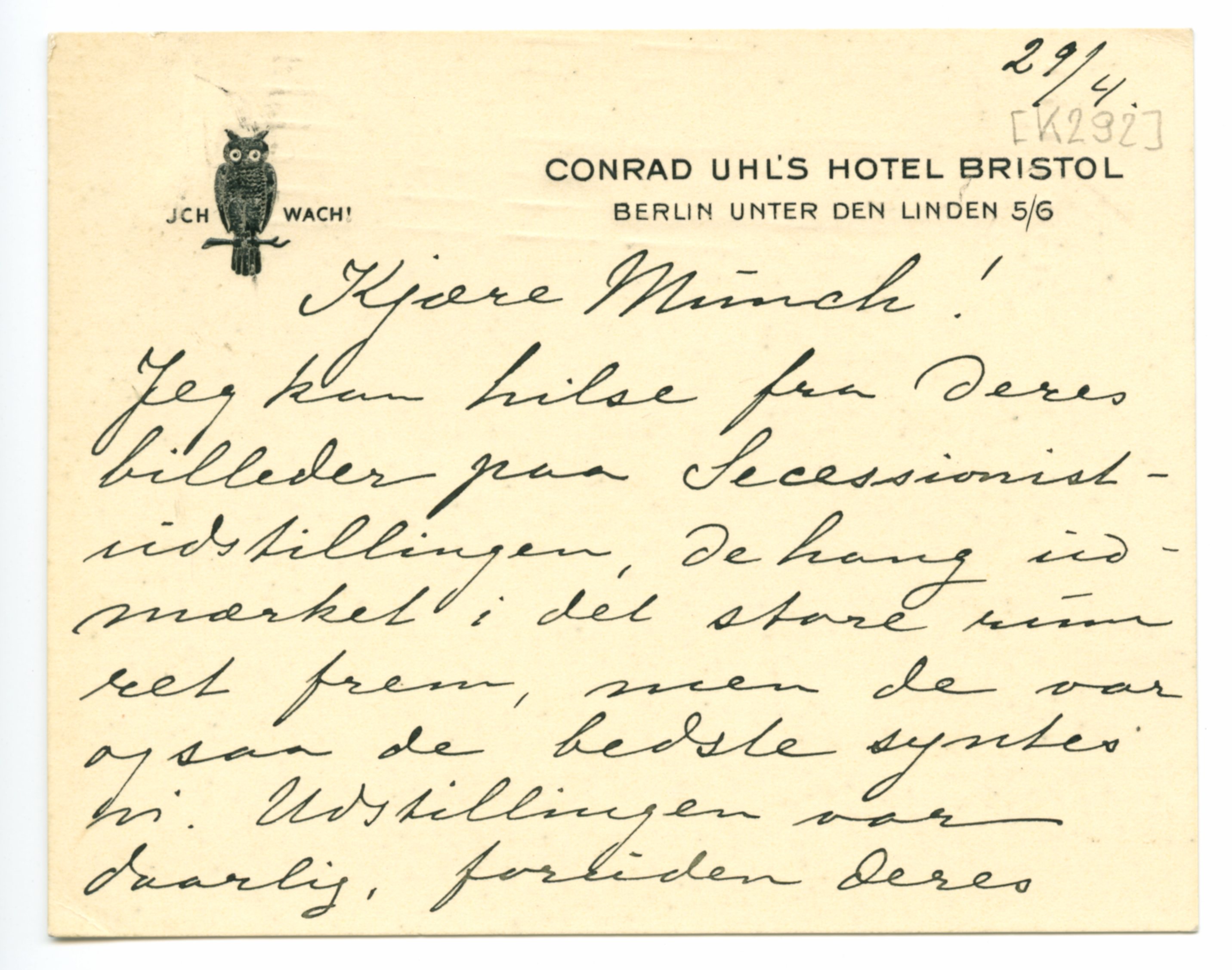 MM K 292, Munchmuseet. Datert 29.04.190[?]. Brev fra Julie Holmboe.