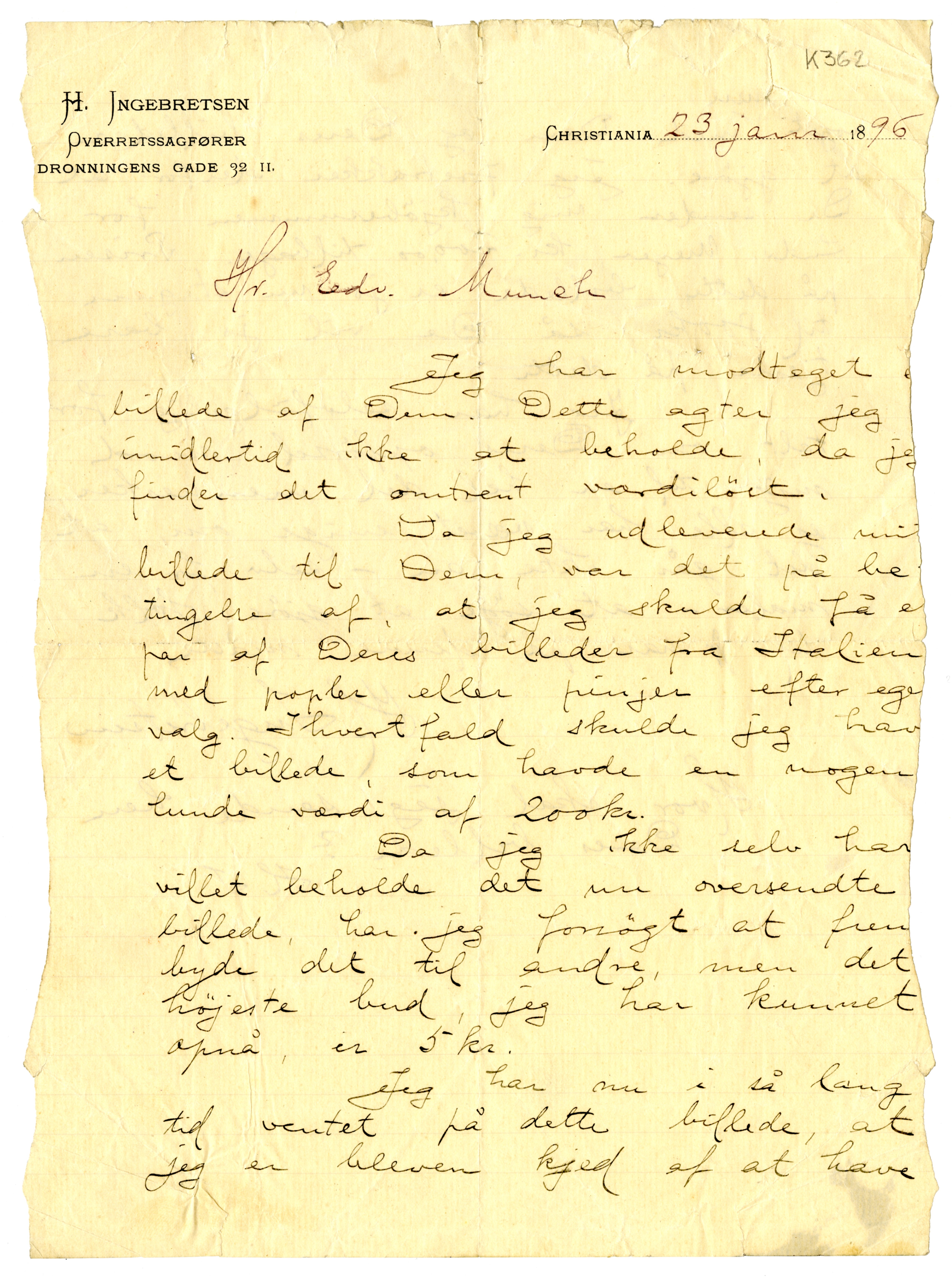 MM K 362, Munchmuseet. Datert 23.01.1896. Brev fra Harald Ingebretsen.