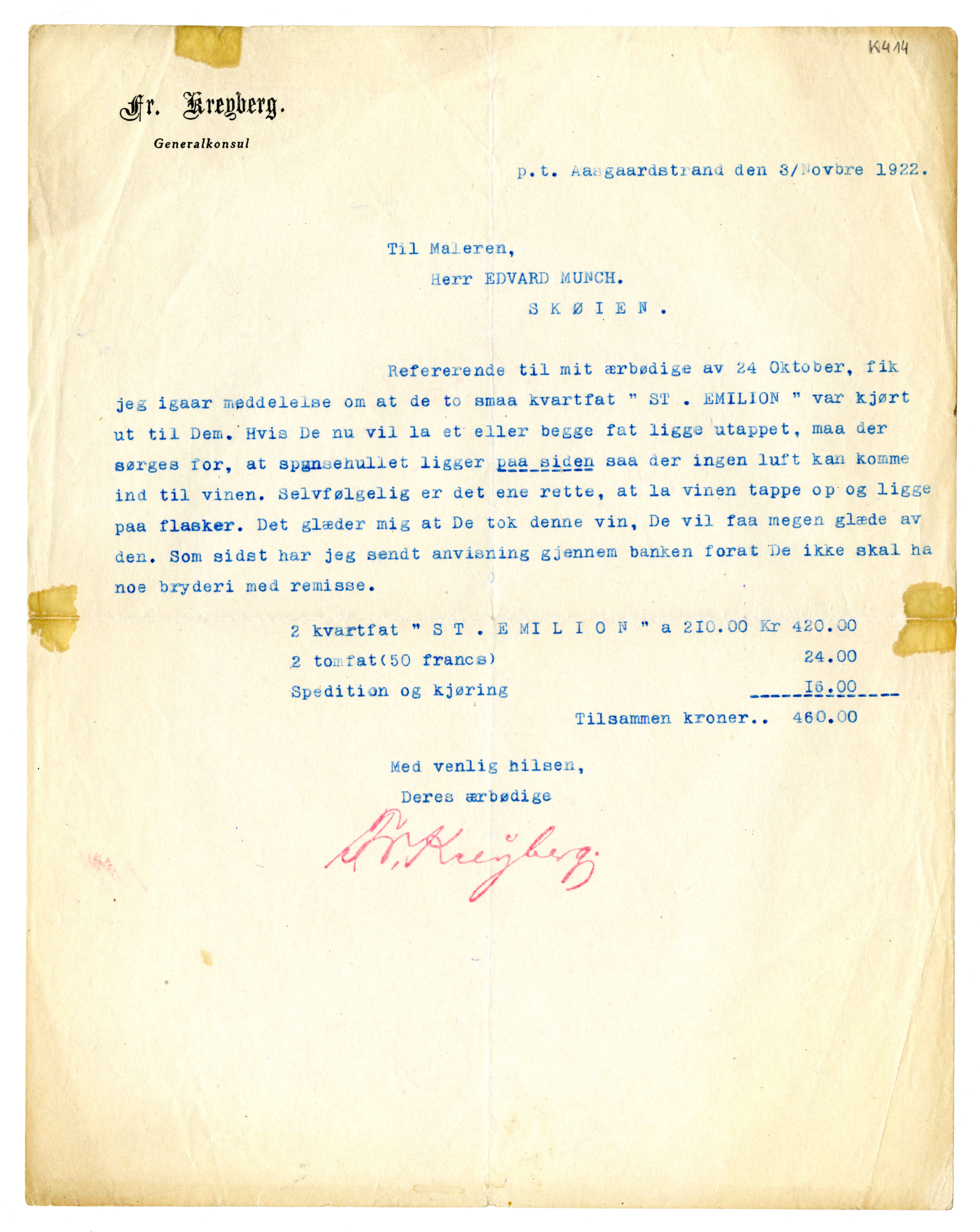 MM K 414, Munchmuseet. Datert 03.11.1922. Brev fra Fr. Kreyberg.