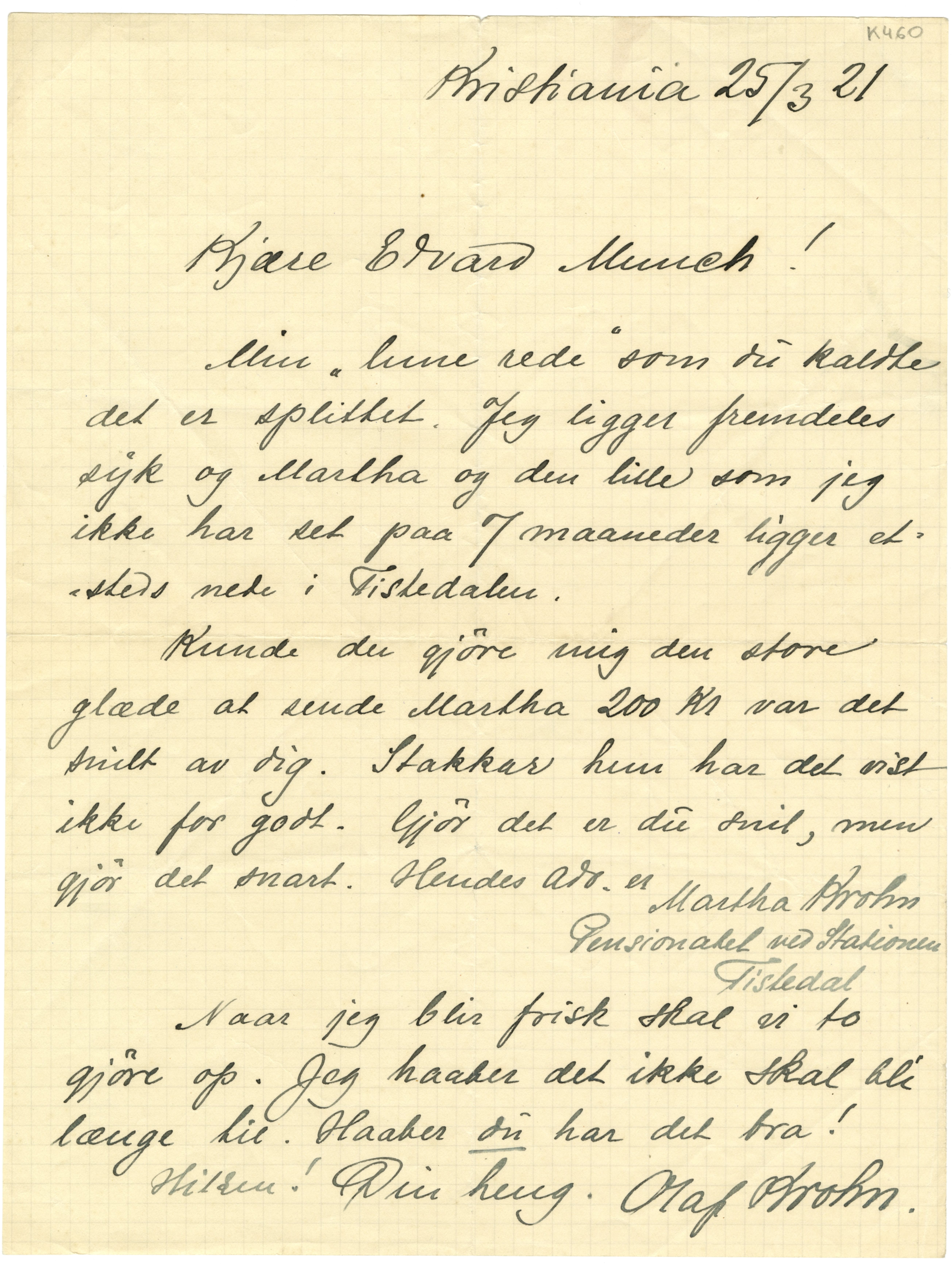 MM K 460, Munchmuseet. Datert 25.03.1921. Brev fra Olaf Krohn.