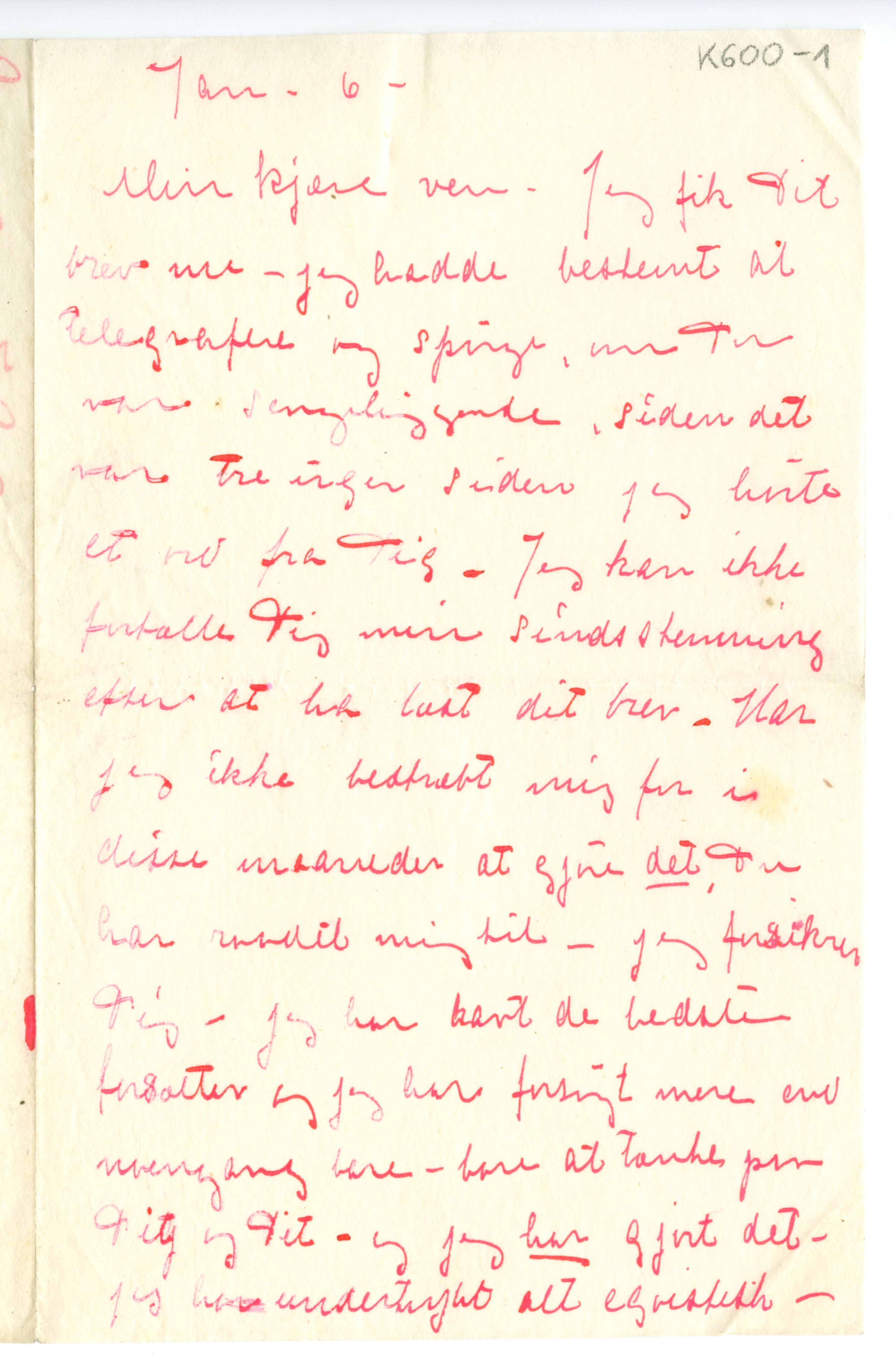MM K 600, Munchmuseet. Datert 06.01.[1900]. Brev fra Tulla Larsen.