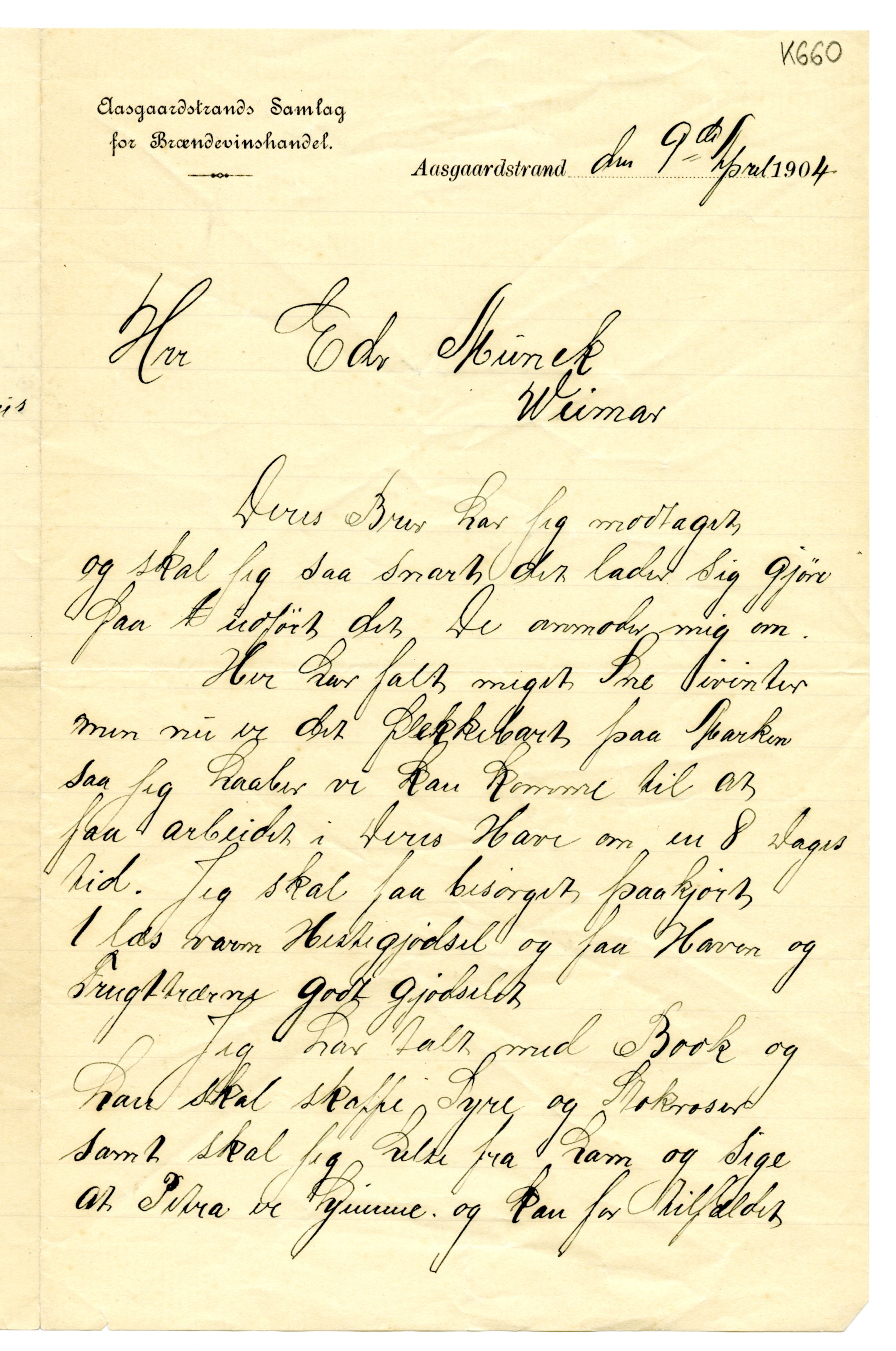 MM K 660, Munchmuseet. Datert 09.04.1904. Brev fra L.M. Larssen, Åsgårdstrands Samlag for Brændevinshandel.