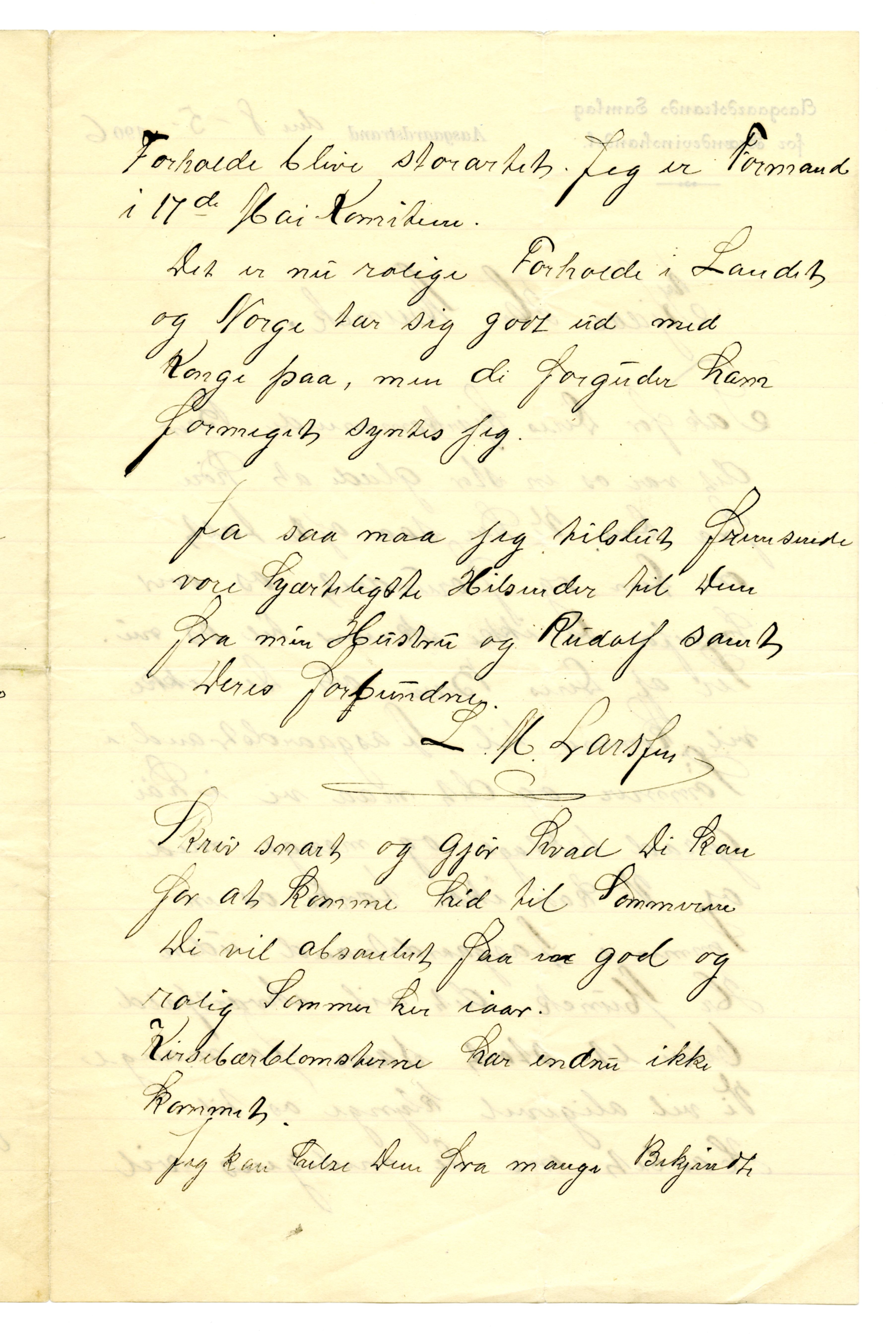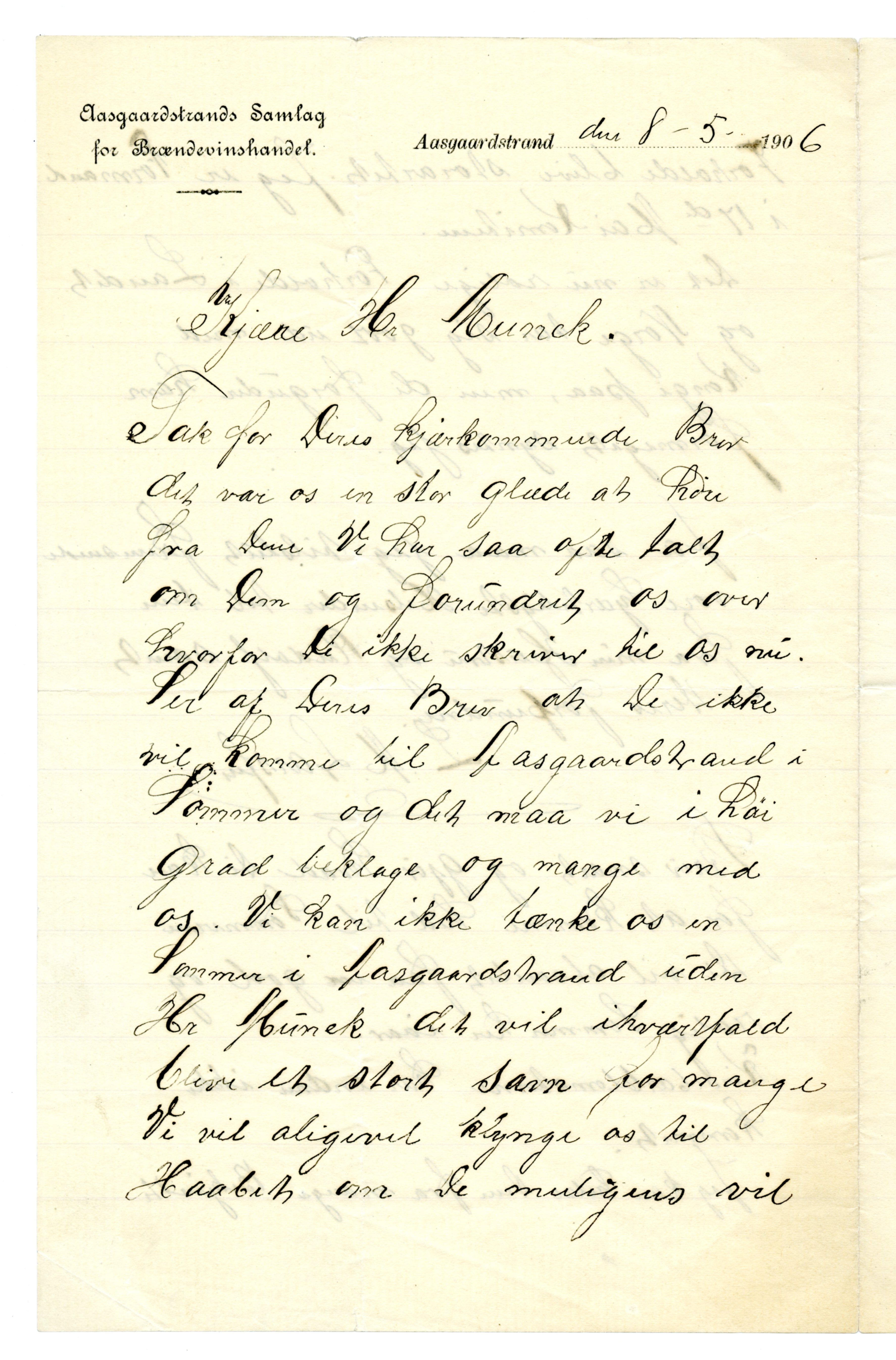 MM K 662, Munchmuseet. Datert 08.05.1906. Brev fra L.M. Larssen, Åsgårdstrands Samlag for Brændevinshandel.