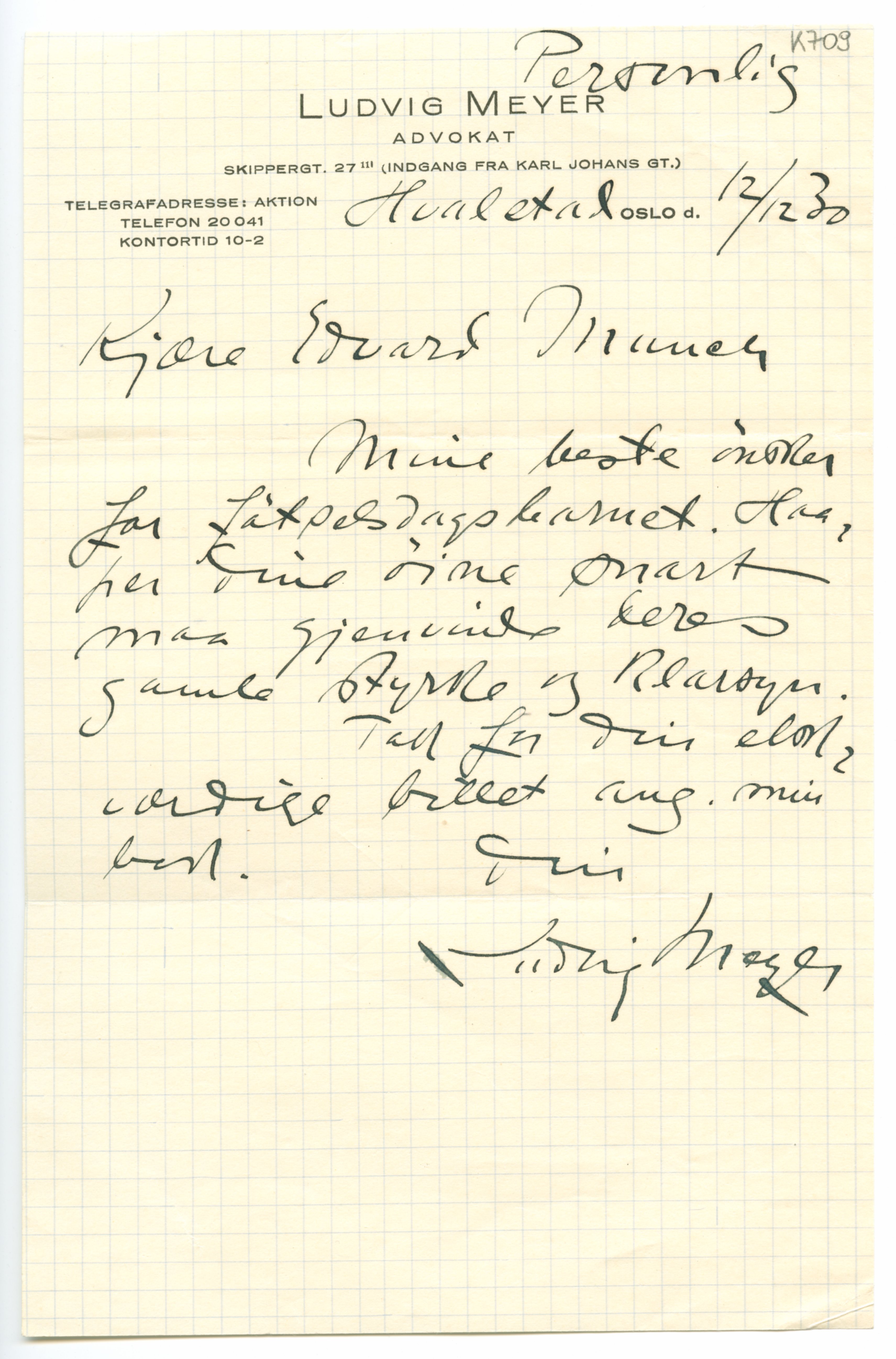MM K 709, Munchmuseet. Datert 12.12.1930. Brev fra Ludvig Meyer.
