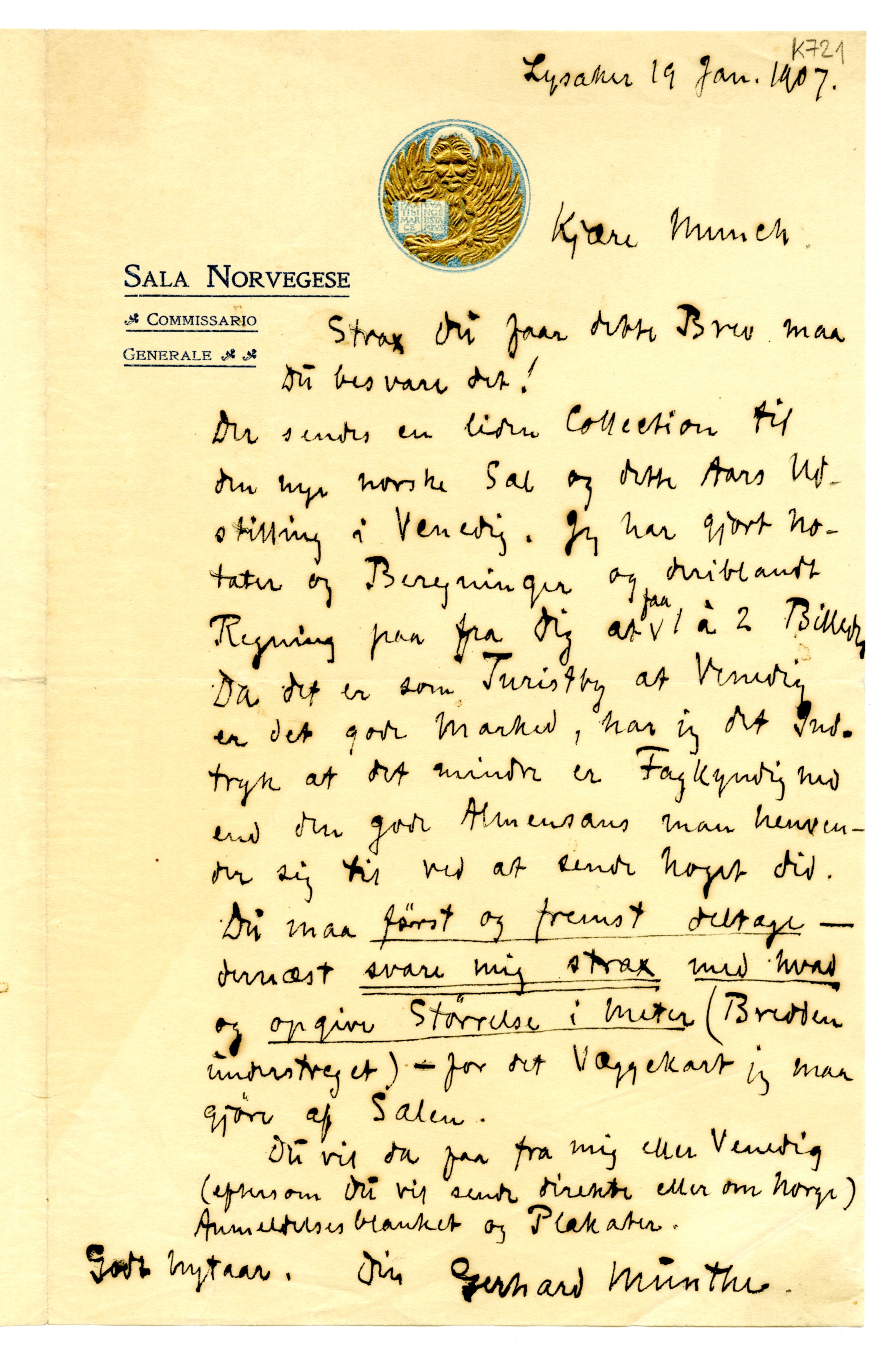 MM K 721, Munchmuseet. Datert 19.01.1907. Brev fra Gerhard Munthe.