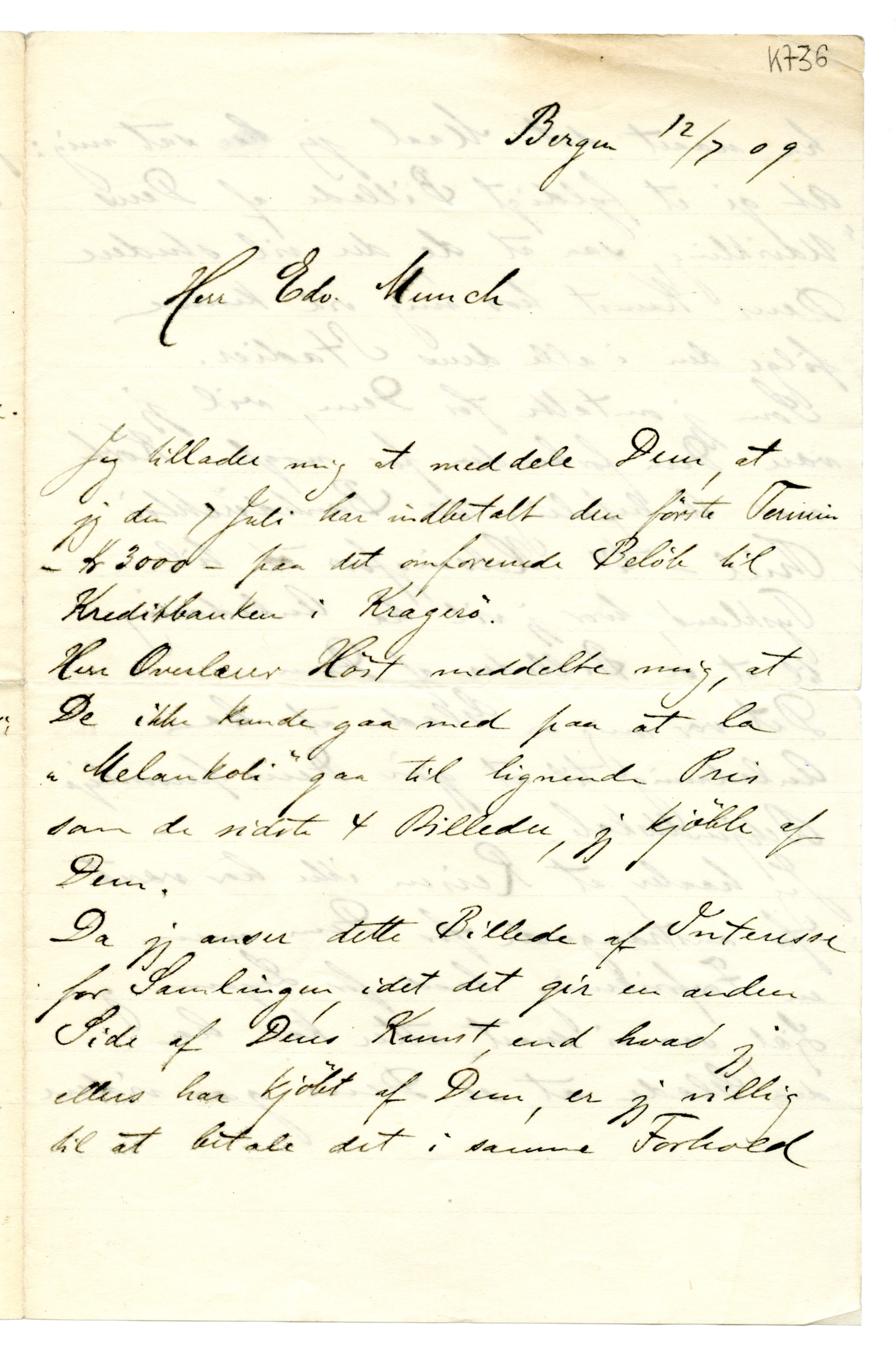 MM K 736, Munchmuseet. Datert 12.07.1909. Brev fra Rasmus Meyer.