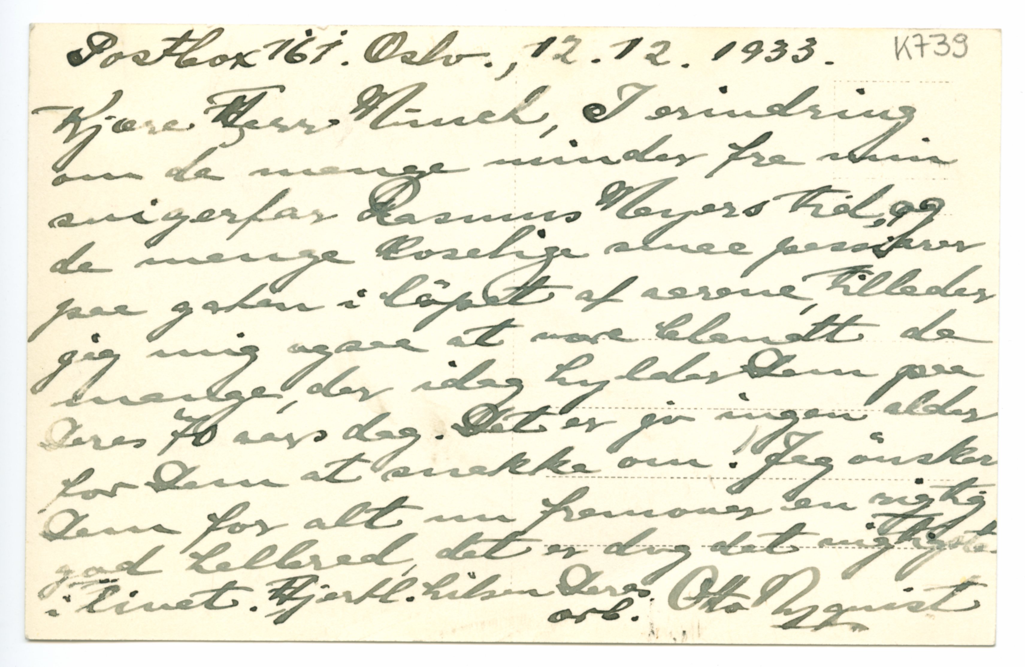 MM K 739, Munchmuseet. Datert 12.12.1933. Brev fra Odd Nyquist.