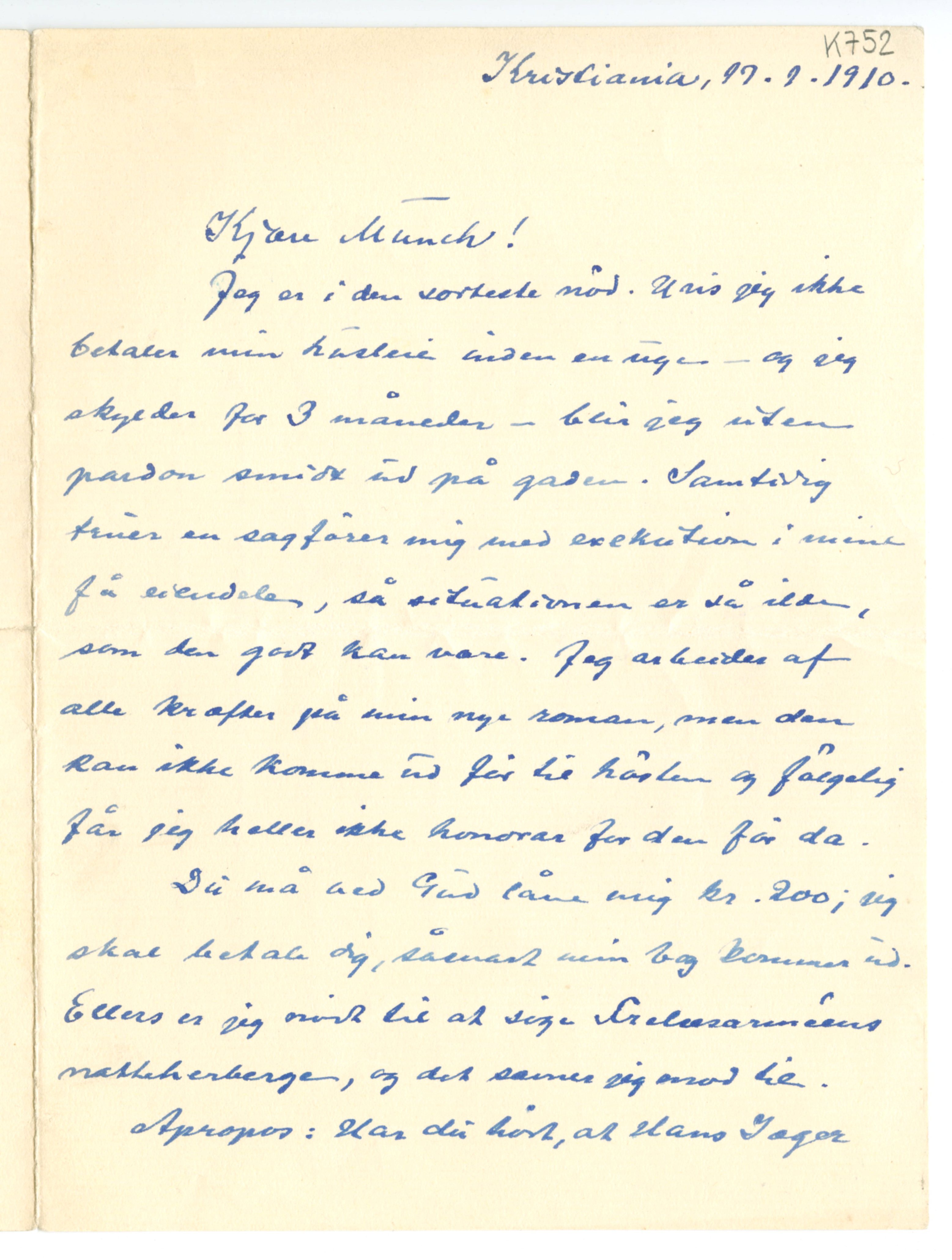 MM K 752, Munchmuseet. Datert 17.01.1910. Brev fra Jappe Nilssen.