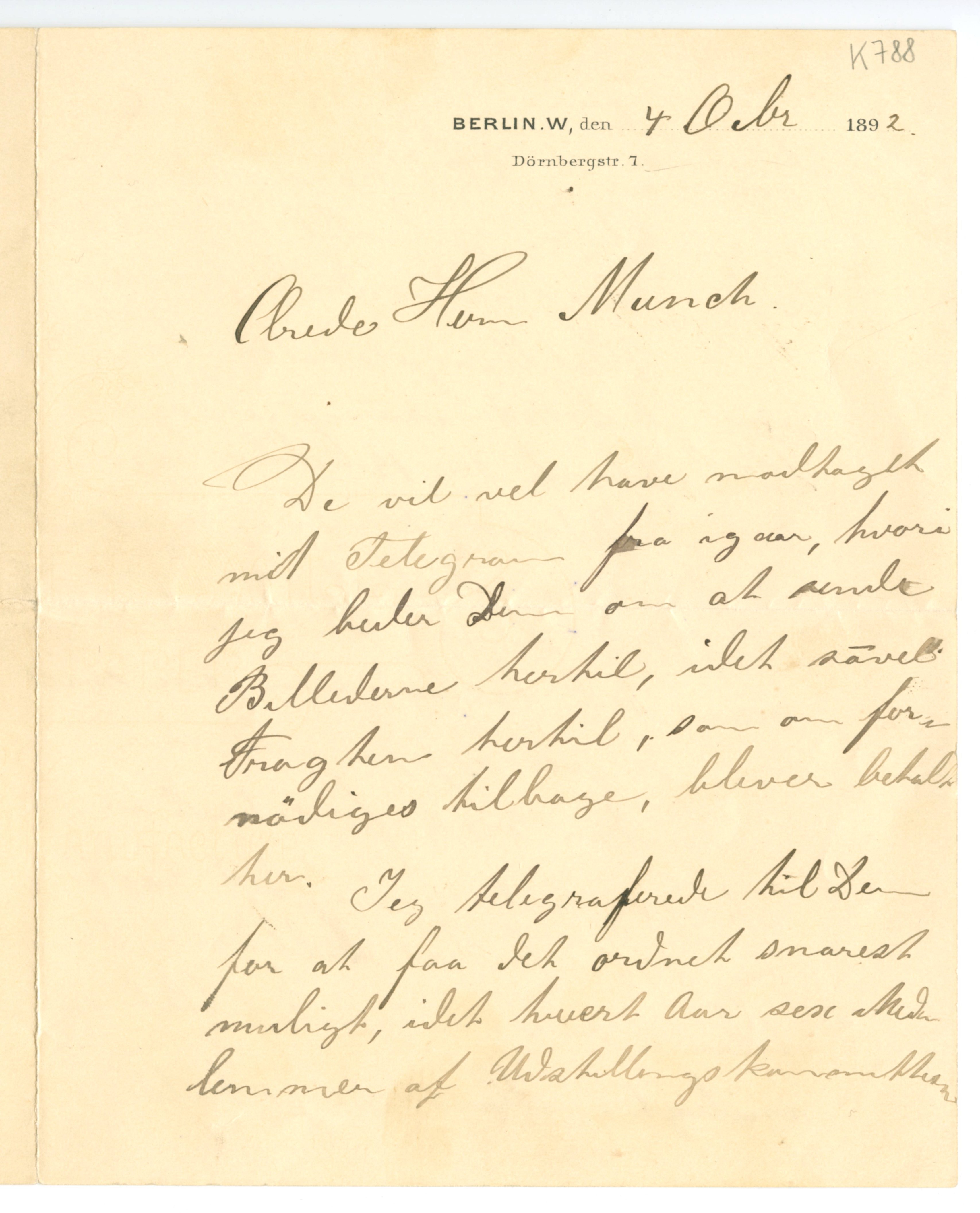 MM K 788, Munchmuseet. Datert 04.10.1892. Brev fra Adelsteen Normann.