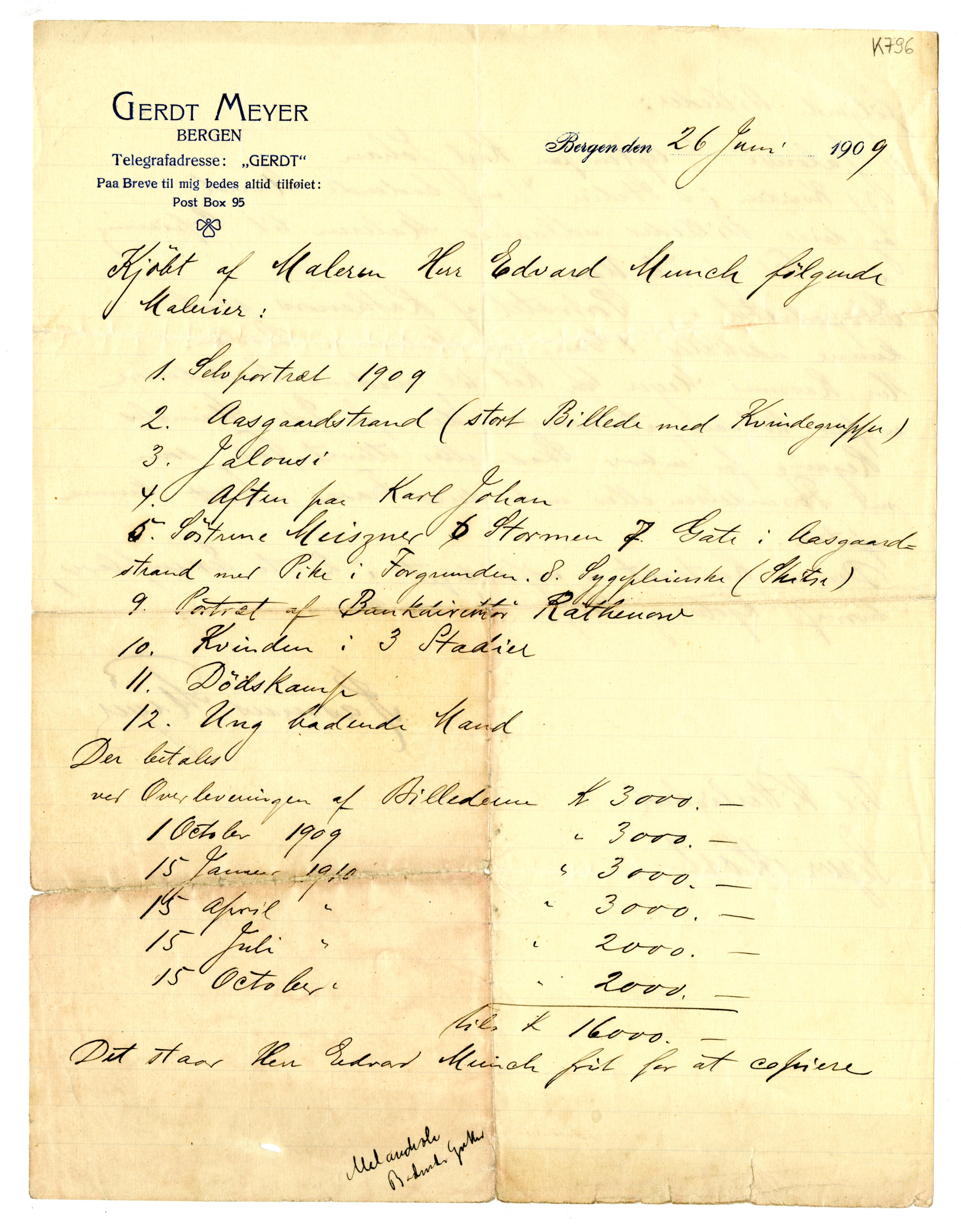 MM K 796, Munchmuseet. Datert 26.06.1909. Brev fra Rasmus Meyer, Sigurd Høst.
