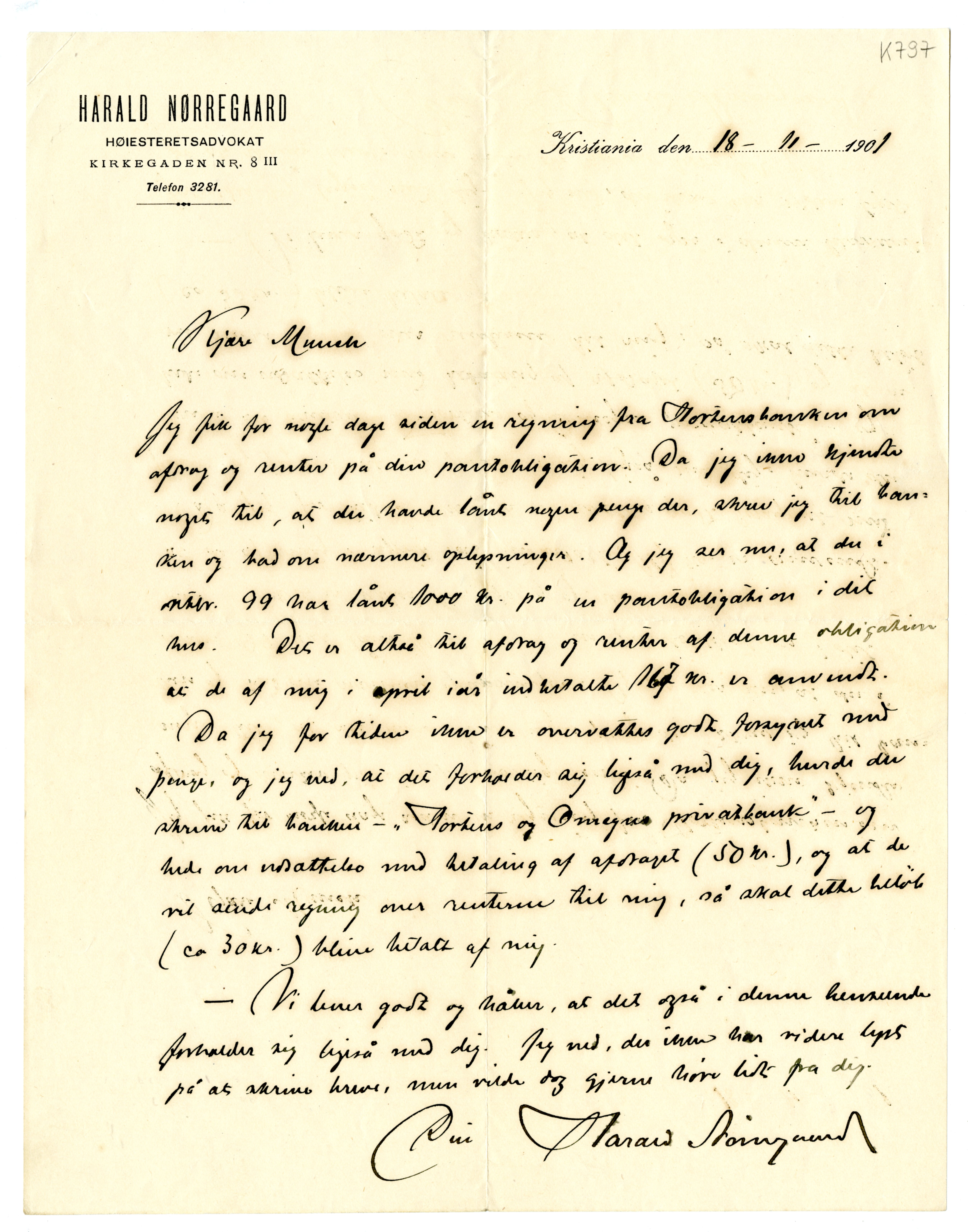 MM K 797, Munchmuseet. Datert 18.11.1901. Brev fra Harald Nørregaard.
