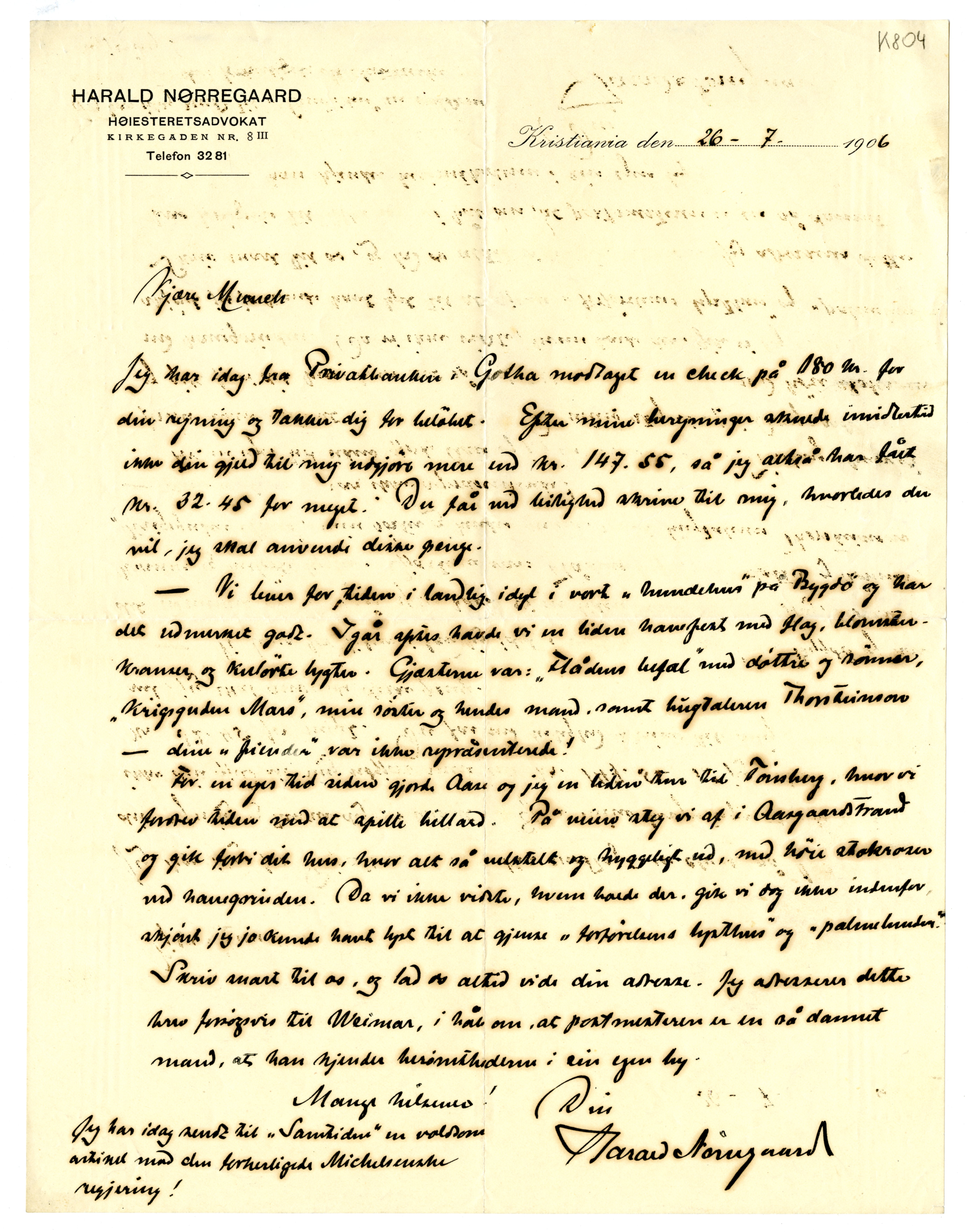 MM K 804, Munchmuseet. Datert 26.07.1906. Brev fra Harald Nørregaard.