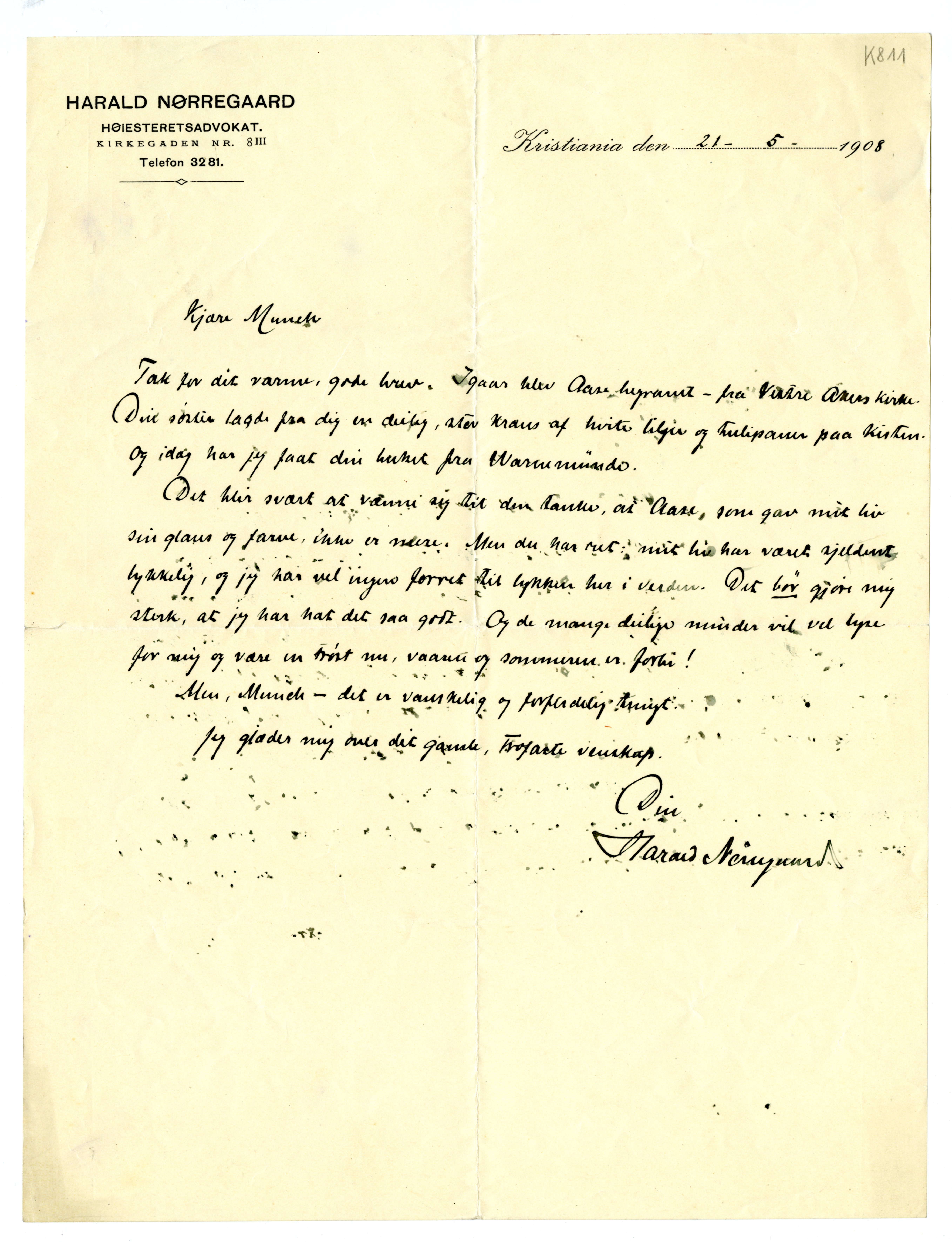 MM K 811, Munchmuseet. Datert 21.05.1908. Brev fra Harald Nørregaard.