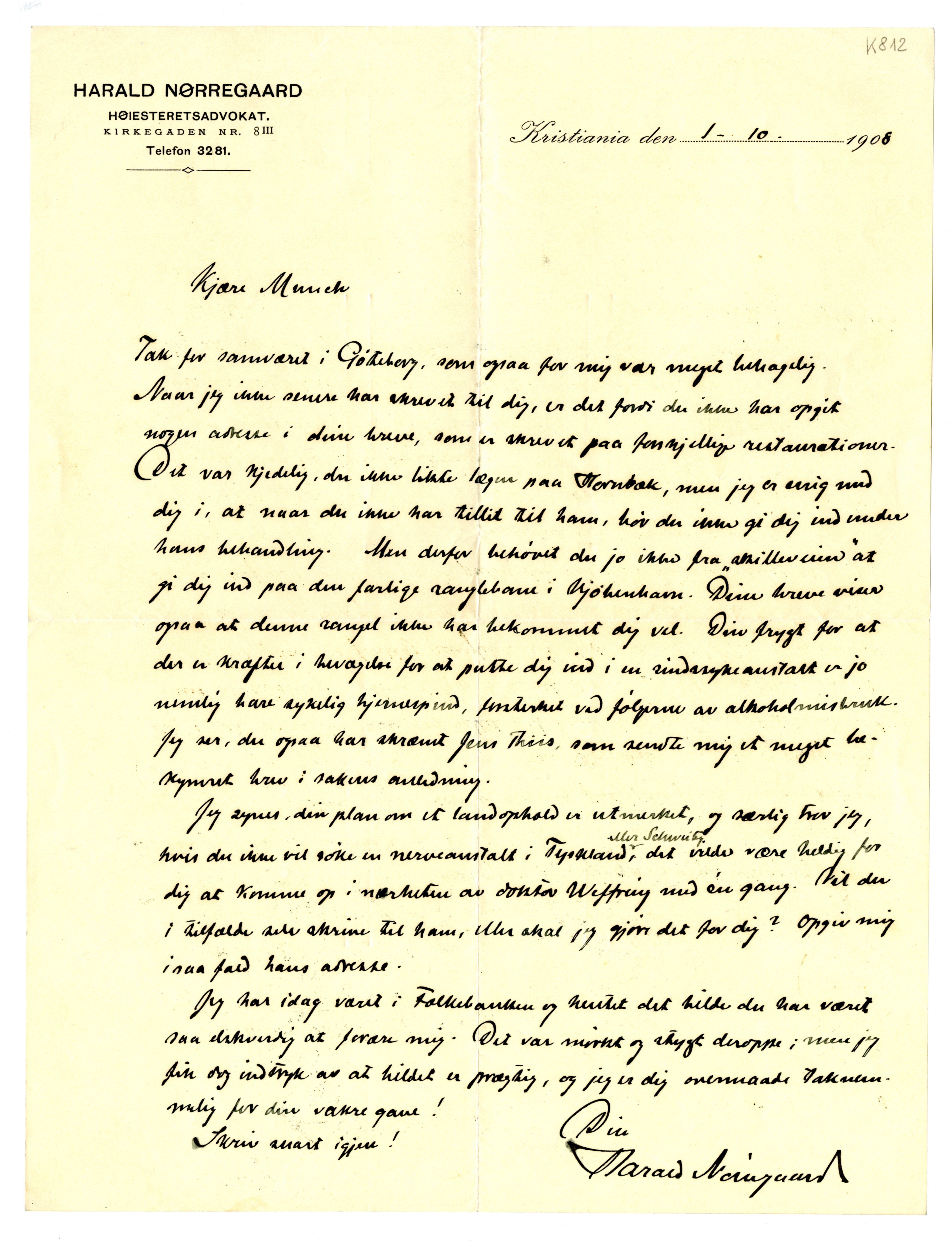 MM K 812, Munchmuseet. Datert 01.10.1908. Brev fra Harald Nørregaard.