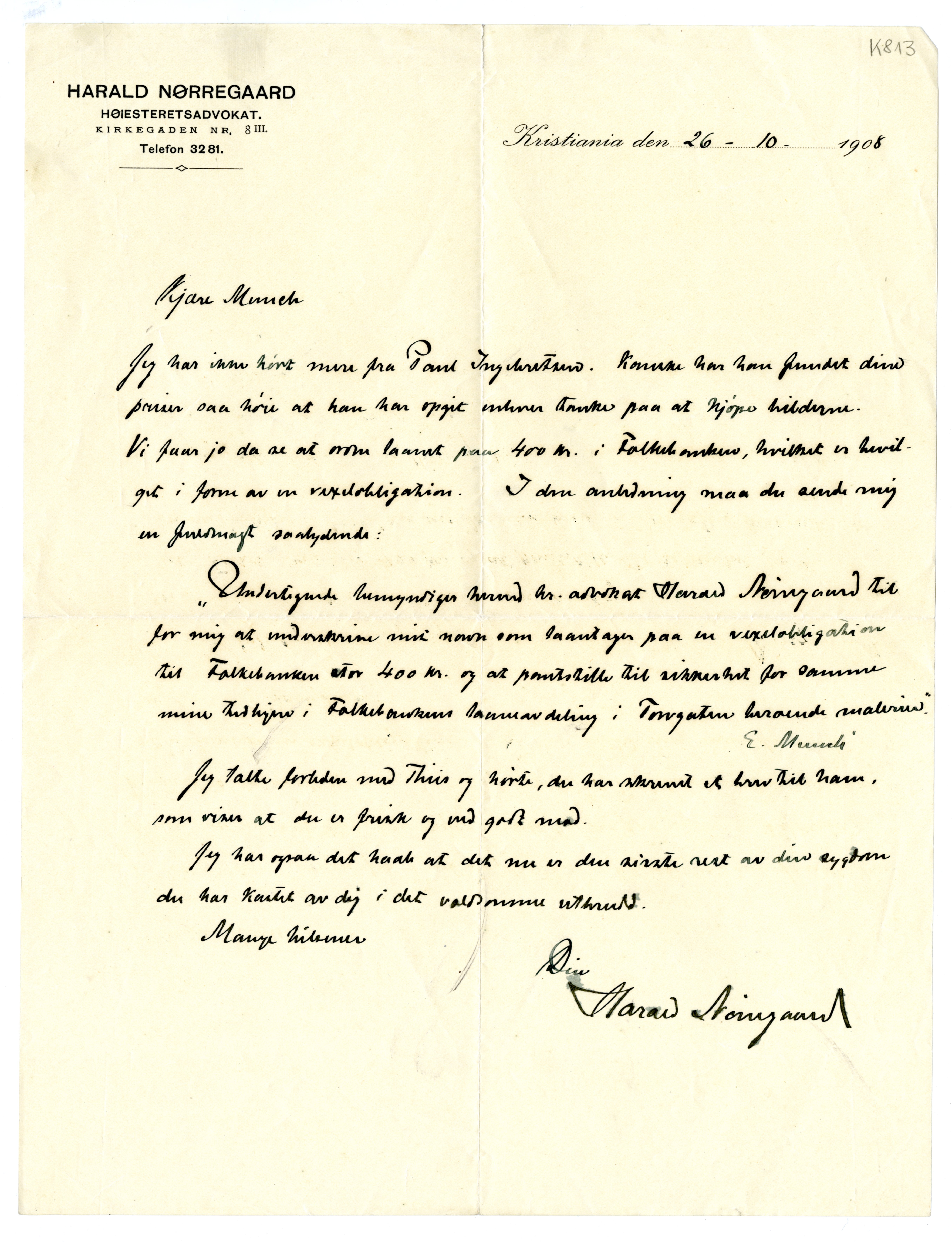 MM K 813, Munchmuseet. Datert 26.10.1908. Brev fra Harald Nørregaard.