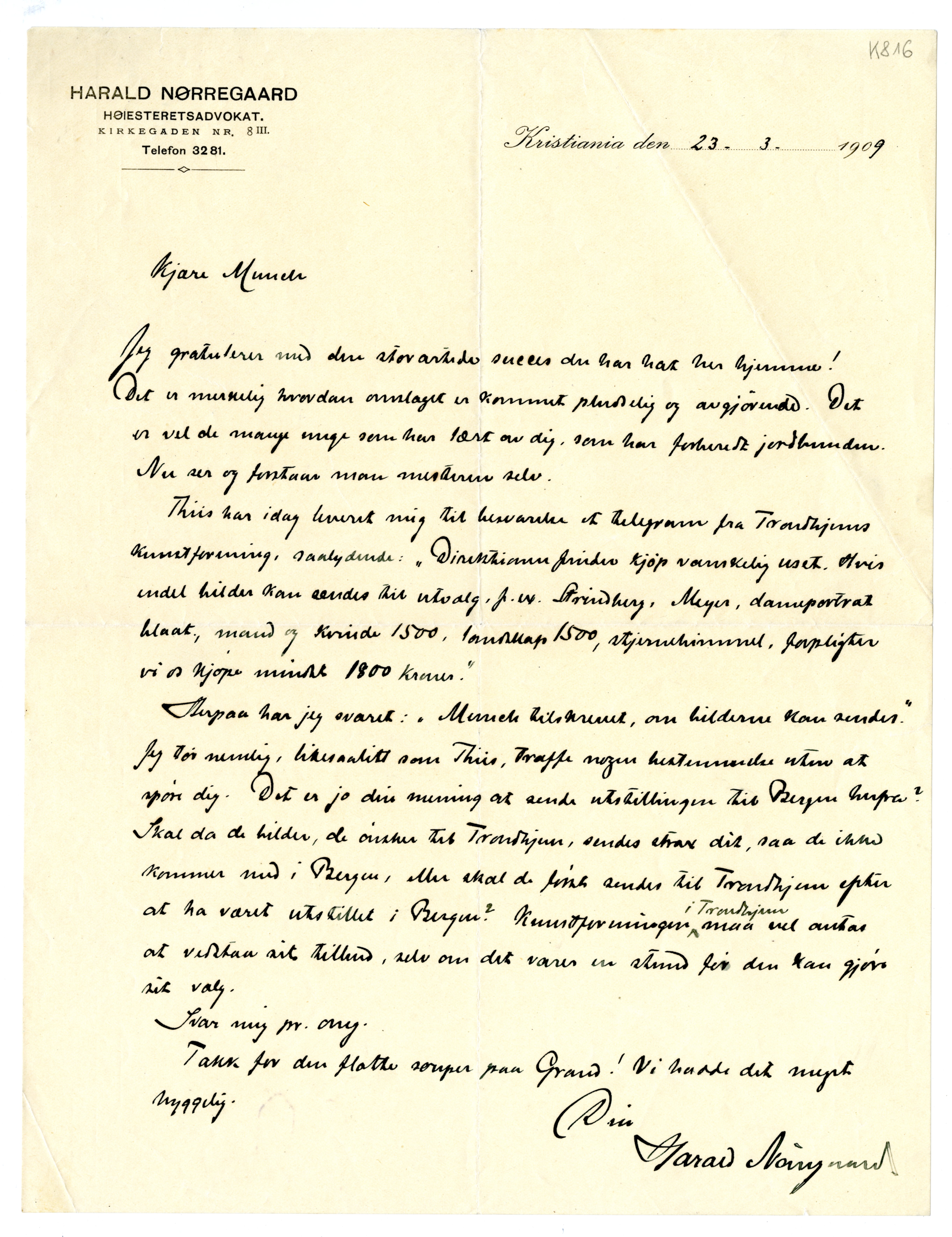 MM K 816, Munchmuseet. Datert 23.03.1909. Brev fra Harald Nørregaard.