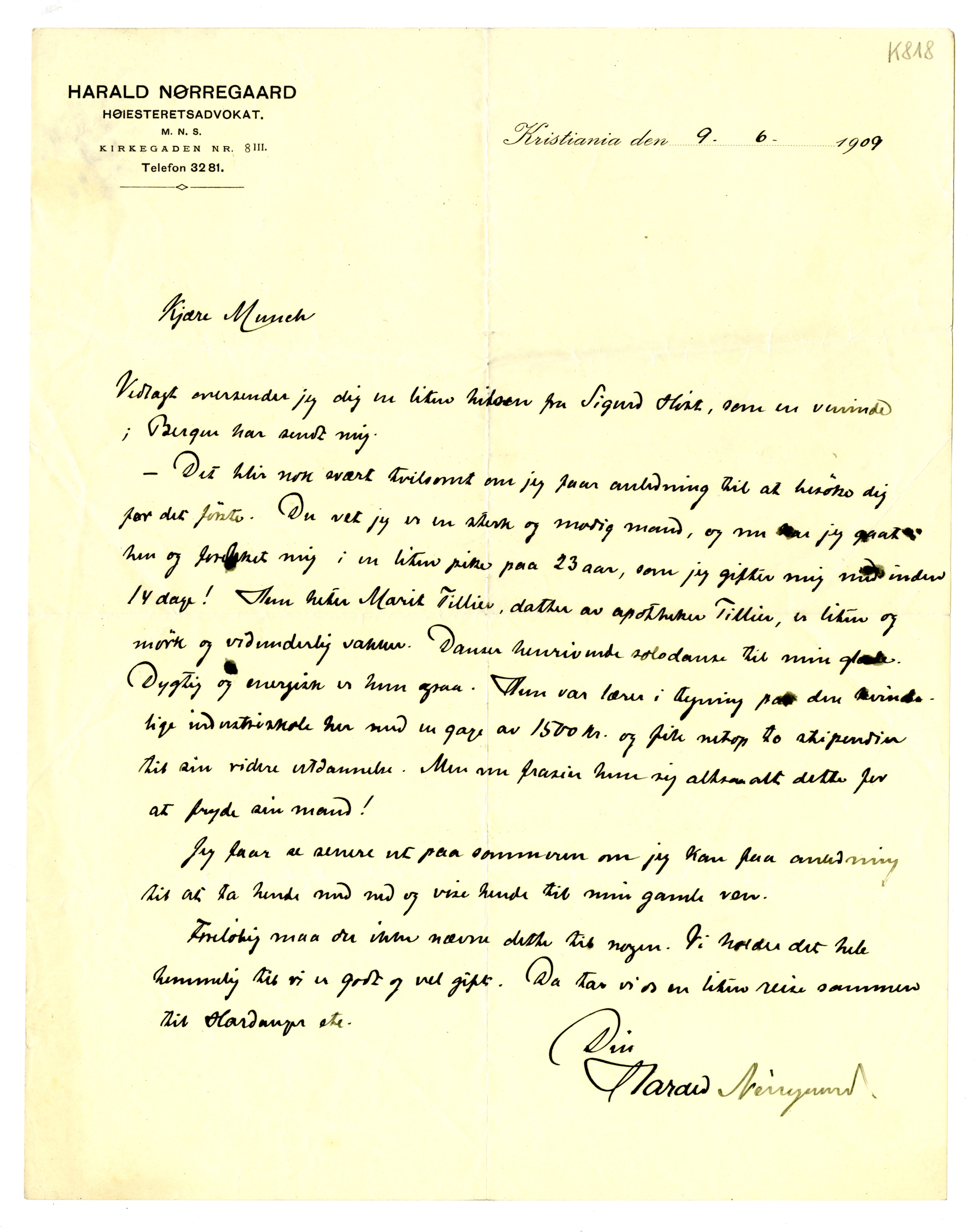 MM K 818, Munchmuseet. Datert 09.06.1909. Brev fra Harald Nørregaard.