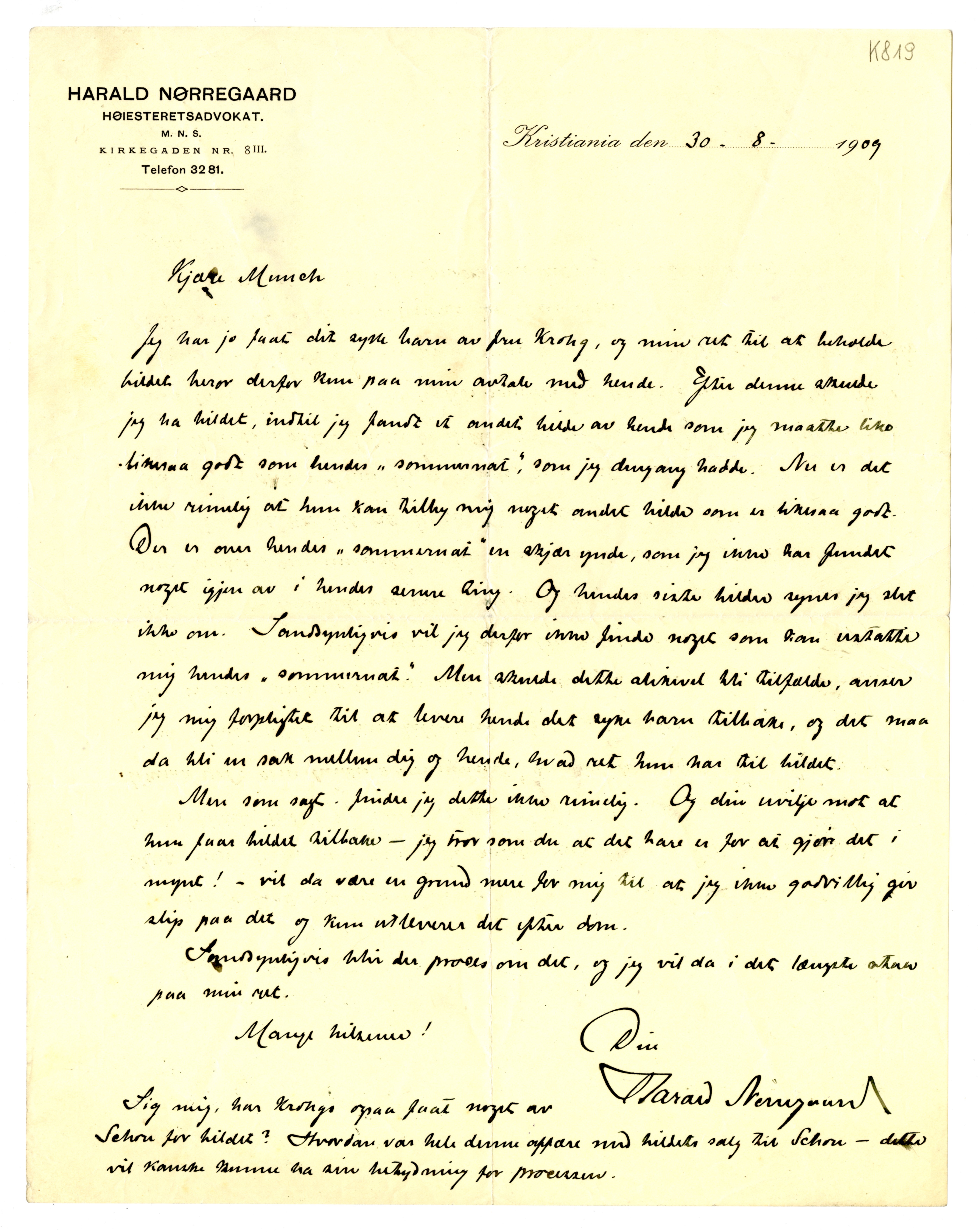 MM K 819, Munchmuseet. Datert 30.08.1909. Brev fra Harald Nørregaard.