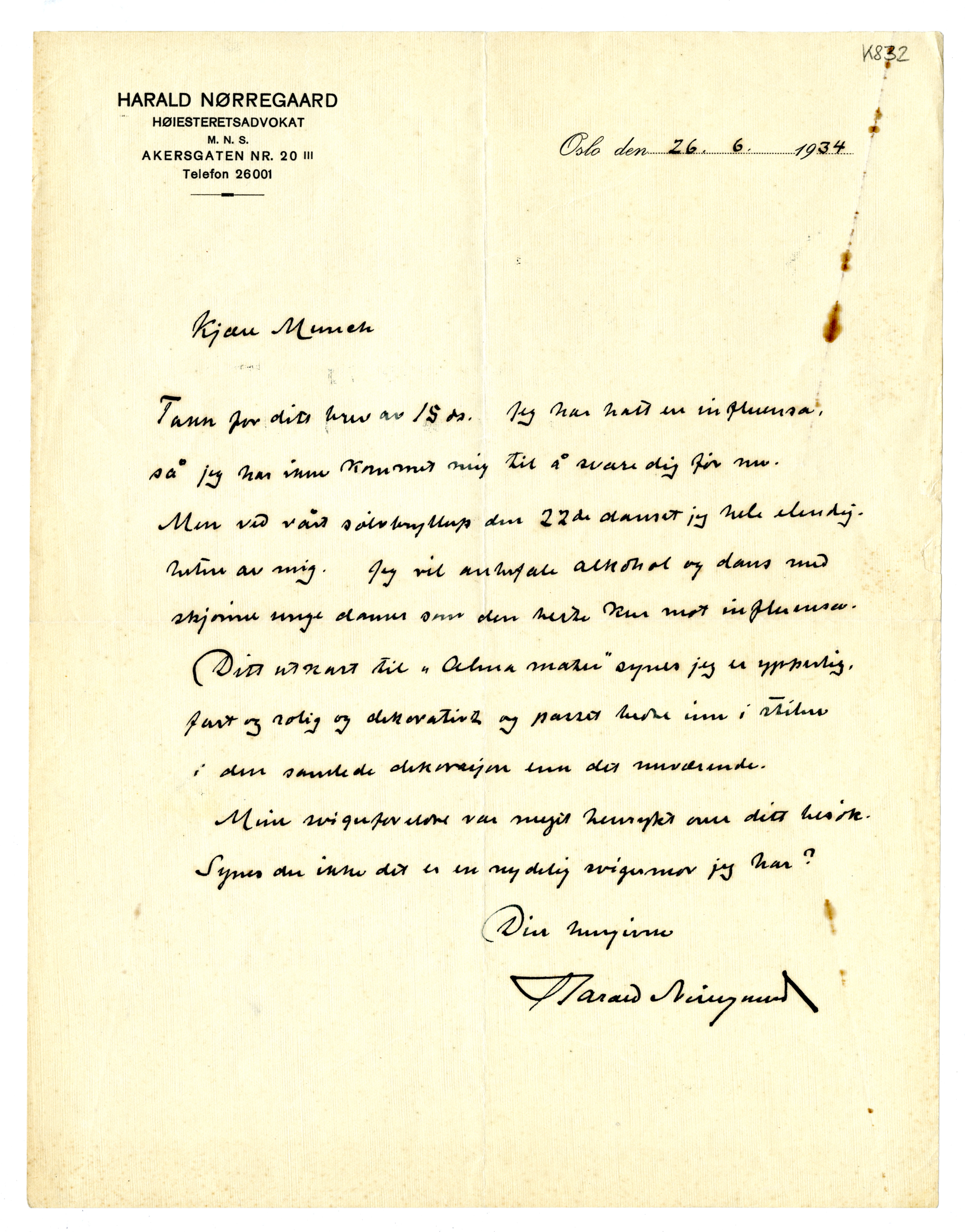 MM K 832, Munchmuseet. Datert 26.06.1934. Brev fra Harald Nørregaard.