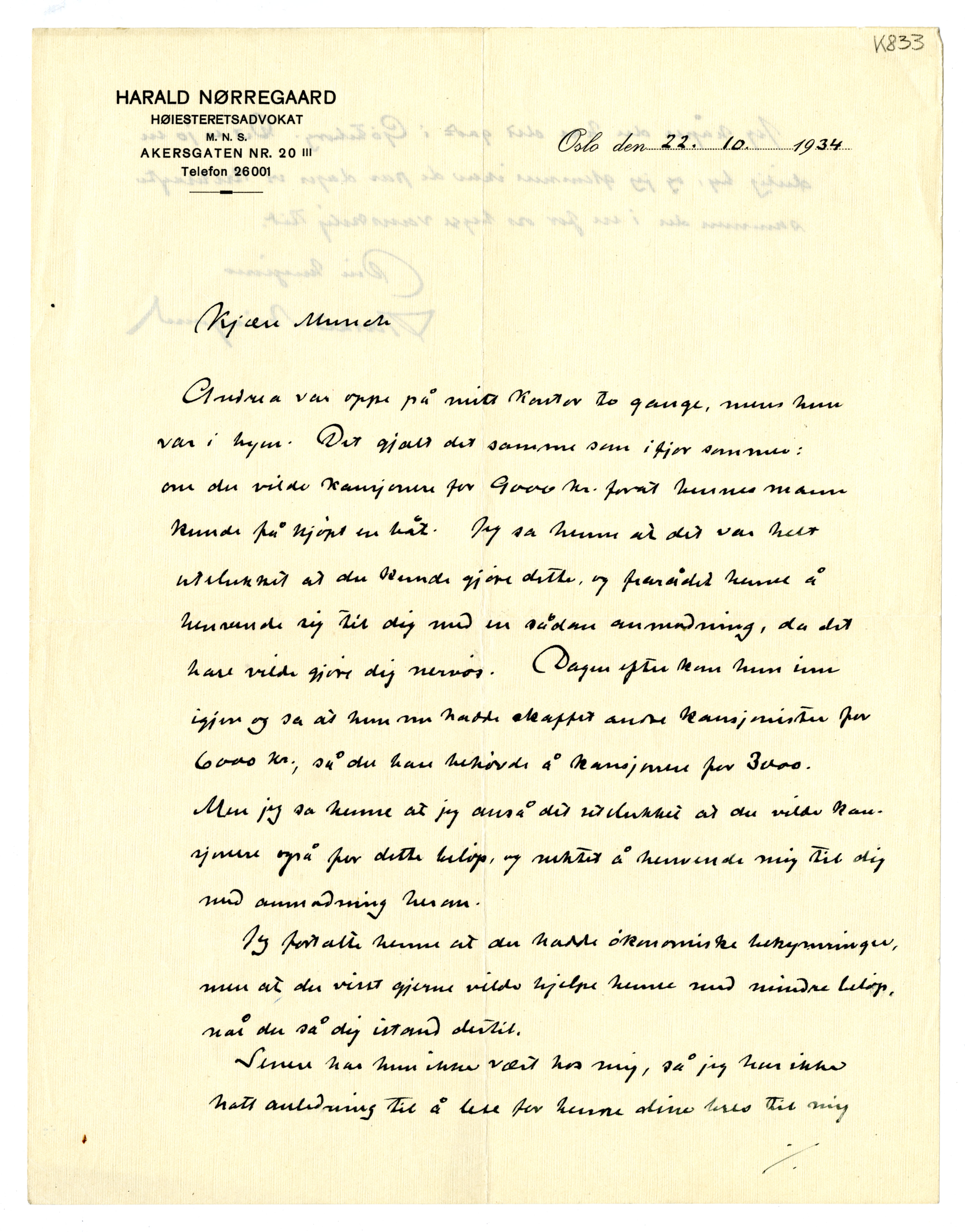 MM K 833, Munchmuseet. Datert 22.10.1934. Brev fra Harald Nørregaard.