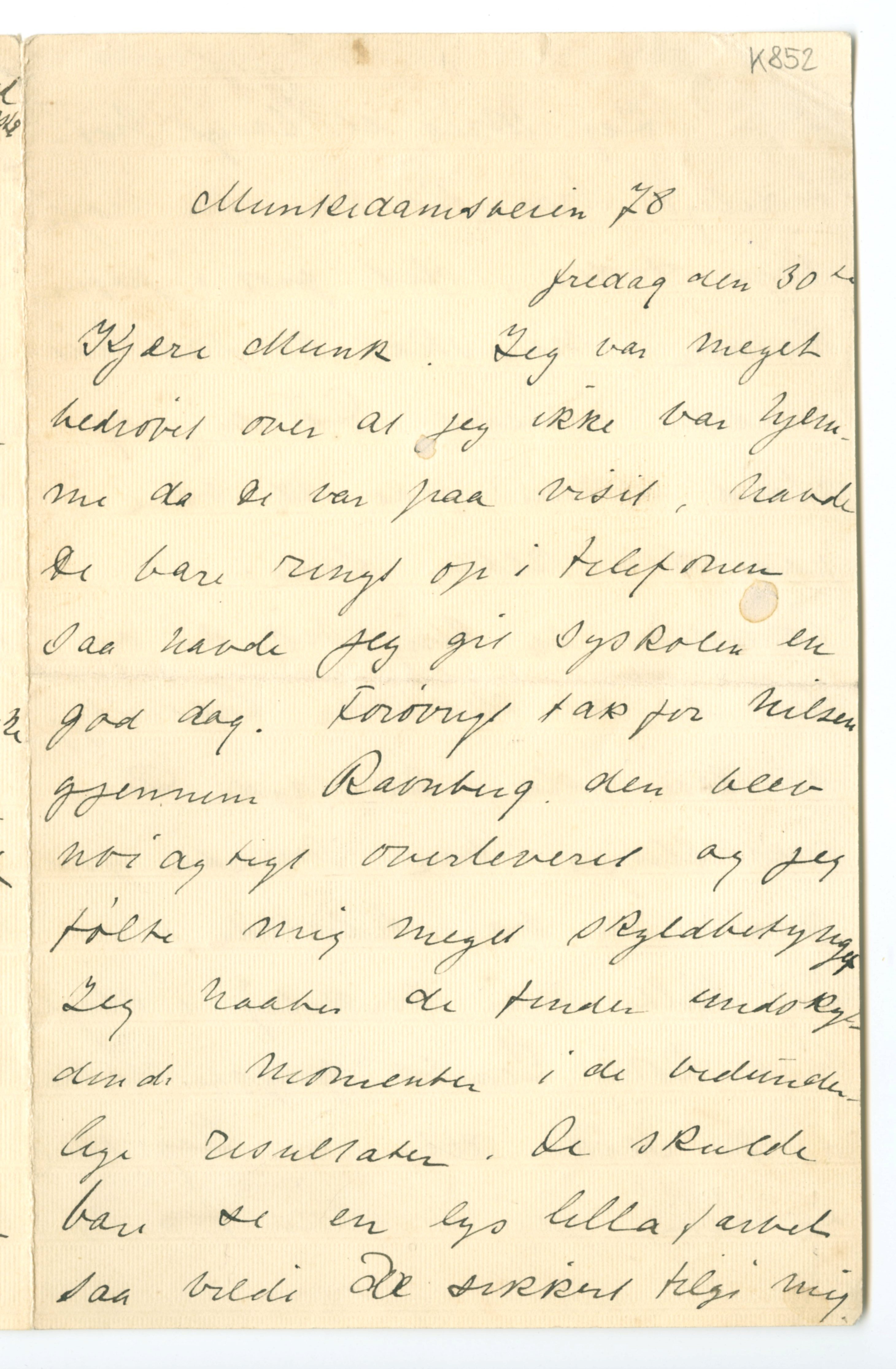 MM K 852, Munchmuseet. Datert 30.09.1904. Brev fra Aase Nørregaard.